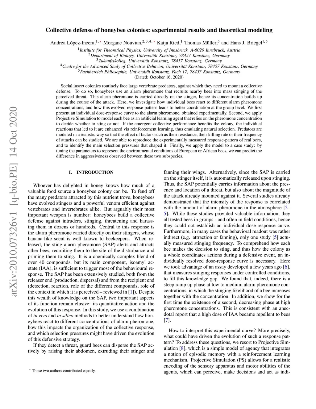Social insect colonies routinely face large vertebrate predators, against which they need to mount a collective defense. To do so, honeybees use an alarm pheromone that recruits nearby bees into mass stinging of the perceived threat. This alarm pheromone is carried directly on the stinger, hence its concentration builds up during the course of the attack. Here, we investigate how individual bees react to different alarm pheromone concentrations, and how this evolved response-pattern leads to better coordination at the group level. We first present an individual dose-response curve to the alarm pheromone, obtained experimentally. Second, we apply Projective Simulation to model each bee as an artificial learning agent that relies on the pheromone concentration to decide whether to sting or not. If the emergent collective performance benefits the colony, the individual reactions that led to it are enhanced via reinforcement learning, thus emulating natural selection. Predators are modeled in a realistic way so that the effect of factors such as their resistance, their killing rate or their frequency of attacks can be studied. We are able to reproduce the experimentally measured response-pattern of real bees, and to identify the main selection pressures that shaped it. Finally, we apply the model to a case study: by tuning the parameters to represent the environmental conditions of European or African bees, we can predict the difference in aggressiveness observed between these two subspecies.
