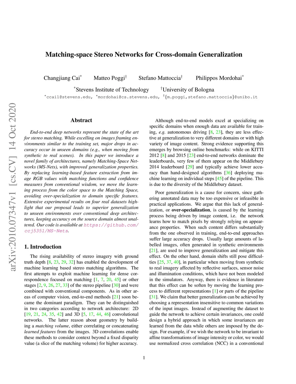 End-to-end deep networks represent the state of the art for stereo matching. While excelling on images framing environments similar to the training set, major drops in accuracy occur in unseen domains (e.g., when moving from synthetic to real scenes). In this paper we introduce a novel family of architectures, namely Matching-Space Networks (MS-Nets), with improved generalization properties. By replacing learning-based feature extraction from image RGB values with matching functions and confidence measures from conventional wisdom, we move the learning process from the color space to the Matching Space, avoiding over-specialization to domain specific features. Extensive experimental results on four real datasets highlight that our proposal leads to superior generalization to unseen environments over conventional deep architectures, keeping accuracy on the source domain almost unaltered. Our code is available at https://github.com/ccj5351/MS-Nets.