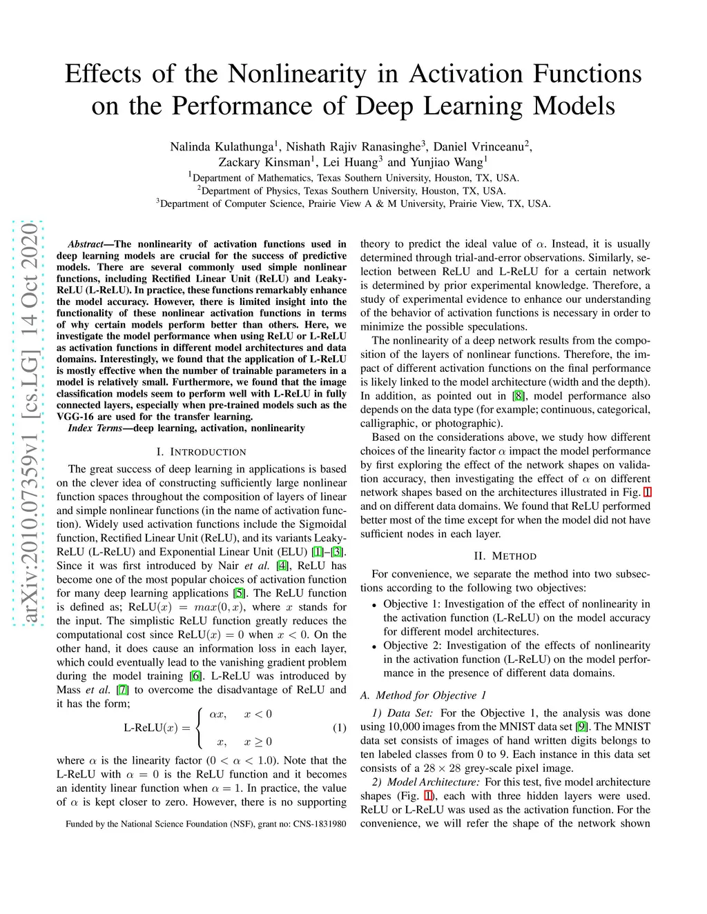 The nonlinearity of activation functions used in deep learning models are crucial for the success of predictive models. There are several commonly used simple nonlinear functions, including Rectified Linear Unit (ReLU) and Leaky-ReLU (L-ReLU). In practice, these functions remarkably enhance the model accuracy. However, there is limited insight into the functionality of these nonlinear activation functions in terms of why certain models perform better than others. Here, we investigate the model performance when using ReLU or L-ReLU as activation functions in different model architectures and data domains. Interestingly, we found that the application of L-ReLU is mostly effective when the number of trainable parameters in a model is relatively small. Furthermore, we found that the image classification models seem to perform well with L-ReLU in fully connected layers, especially when pre-trained models such as the VGG-16 are used for the transfer learning.