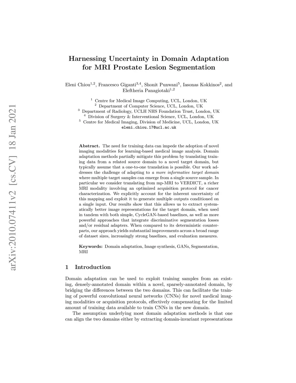 The need for training data can impede the adoption of novel imaging modalities for learning-based medical image analysis. Domain adaptation methods partially mitigate this problem by translating training data from a related source domain to a novel target domain, but typically assume that a one-to-one translation is possible. Our work addresses the challenge of adapting to a more informative target domain where multiple target samples can emerge from a single source sample. In particular we consider translating from mp-MRI to VERDICT, a richer MRI modality involving an optimized acquisition protocol for cancer characterization. We explicitly account for the inherent uncertainty of this mapping and exploit it to generate multiple outputs conditioned on a single input. Our results show that this allows us to extract systematically better image representations for the target domain, when used in tandem with both simple, CycleGAN-based baselines, as well as more powerful approaches that integrate discriminative segmentation losses and/or residual adapters. When compared to its deterministic counterparts, our approach yields substantial improvements across a broad range of dataset sizes, increasingly strong baselines, and evaluation measures.