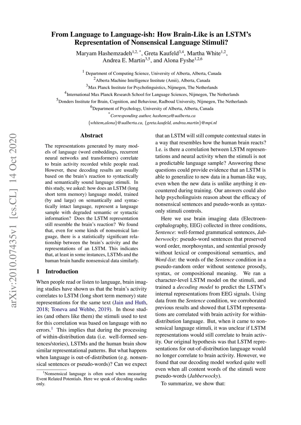 The representations generated by many models of language (word embeddings, recurrent neural networks and transformers) correlate to brain activity recorded while people read. However, these decoding results are usually based on the brain's reaction to syntactically and semantically sound language stimuli. In this study, we asked: how does an LSTM (long short term memory) language model, trained (by and large) on semantically and syntactically intact language, represent a language sample with degraded semantic or syntactic information? Does the LSTM representation still resemble the brain's reaction? We found that, even for some kinds of nonsensical language, there is a statistically significant relationship between the brain's activity and the representations of an LSTM. This indicates that, at least in some instances, LSTMs and the human brain handle nonsensical data similarly.