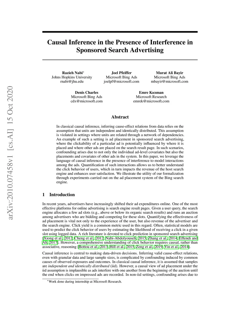 In classical causal inference, inferring cause-effect relations from data relies on the assumption that units are independent and identically distributed. This assumption is violated in settings where units are related through a network of dependencies. An example of such a setting is ad placement in sponsored search advertising, where the clickability of a particular ad is potentially influenced by where it is placed and where other ads are placed on the search result page. In such scenarios, confounding arises due to not only the individual ad-level covariates but also the placements and covariates of other ads in the system. In this paper, we leverage the language of causal inference in the presence of interference to model interactions among the ads. Quantification of such interactions allows us to better understand the click behavior of users, which in turn impacts the revenue of the host search engine and enhances user satisfaction. We illustrate the utility of our formalization through experiments carried out on the ad placement system of the Bing search engine.