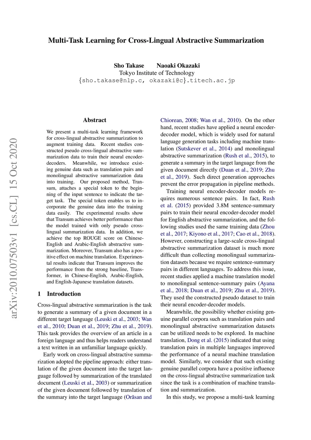 We present a multi-task learning framework for cross-lingual abstractive summarization to augment training data. Recent studies constructed pseudo cross-lingual abstractive summarization data to train their neural encoder-decoders. Meanwhile, we introduce existing genuine data such as translation pairs and monolingual abstractive summarization data into training. Our proposed method, Transum, attaches a special token to the beginning of the input sentence to indicate the target task. The special token enables us to incorporate the genuine data into the training data easily. The experimental results show that Transum achieves better performance than the model trained with only pseudo cross-lingual summarization data. In addition, we achieve the top ROUGE score on Chinese-English and Arabic-English abstractive summarization. Moreover, Transum also has a positive effect on machine translation. Experimental results indicate that Transum improves the performance from the strong baseline, Transformer, in Chinese-English, Arabic-English, and English-Japanese translation datasets.