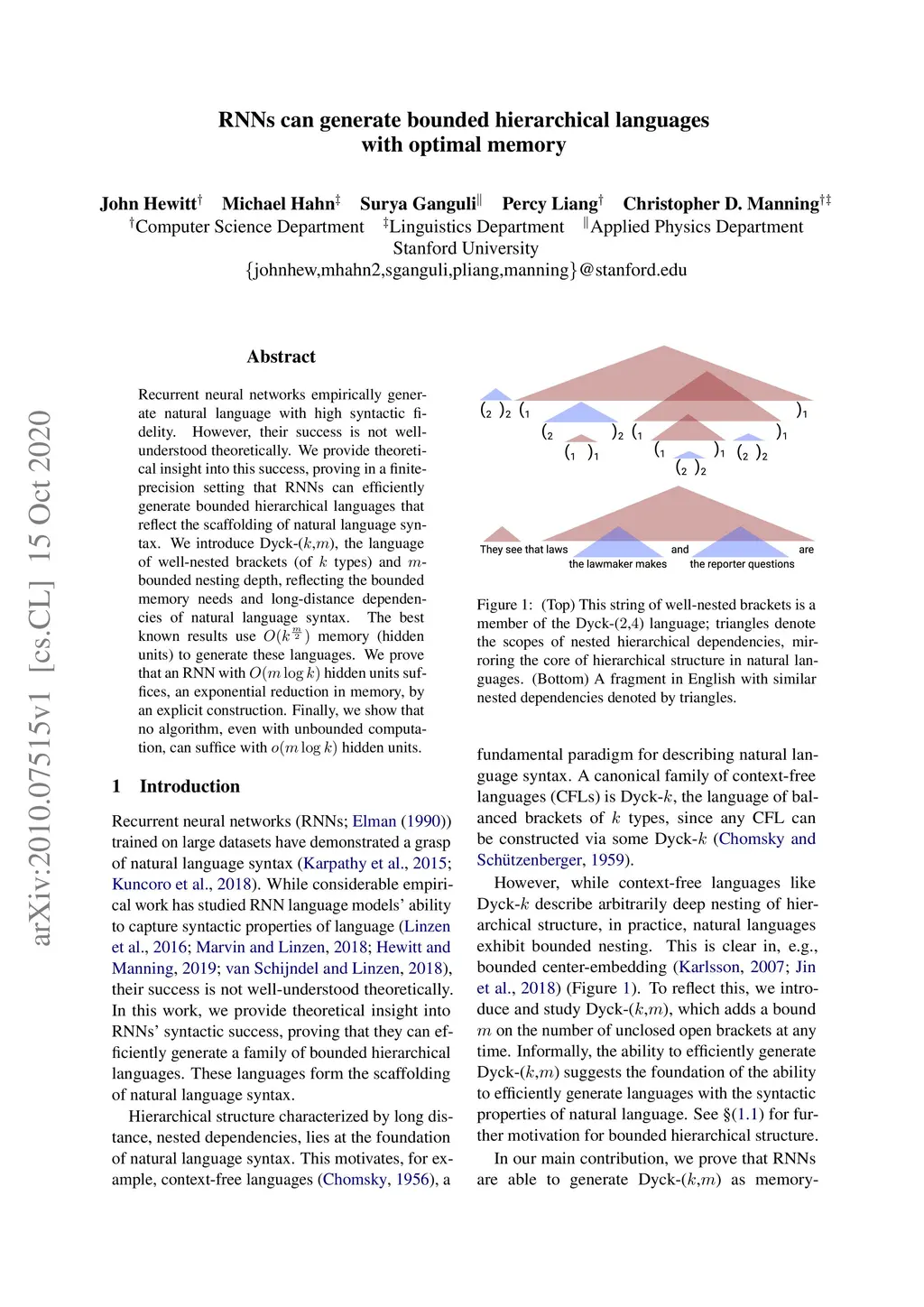 Recurrent neural networks empirically generate natural language with high syntactic fidelity. However, their success is not well-understood theoretically. We provide theoretical insight into this success, proving in a finite-precision setting that RNNs can efficiently generate bounded hierarchical languages that reflect the scaffolding of natural language syntax. We introduce Dyck-(,), the language of well-nested brackets (of types) and -bounded nesting depth, reflecting the bounded memory needs and long-distance dependencies of natural language syntax. The best known results use memory (hidden units) to generate these languages. We prove that an RNN with hidden units suffices, an exponential reduction in memory, by an explicit construction. Finally, we show that no algorithm, even with unbounded computation, can suffice with hidden units.