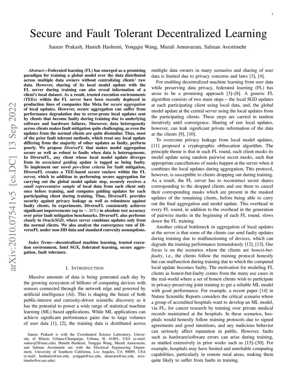 Secure and Fault Tolerant Decentralized Learning