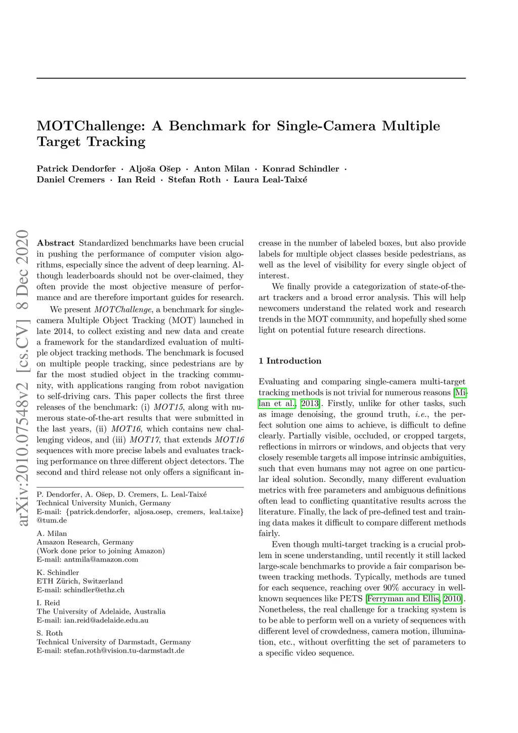 Standardized benchmarks have been crucial in pushing the performance of computer vision algorithms, especially since the advent of deep learning. Although leaderboards should not be over-claimed, they often provide the most objective measure of performance and are therefore important guides for research. We present MOTChallenge, a benchmark for single-camera Multiple Object Tracking (MOT) launched in late 2014, to collect existing and new data, and create a framework for the standardized evaluation of multiple object tracking methods. The benchmark is focused on multiple people tracking, since pedestrians are by far the most studied object in the tracking community, with applications ranging from robot navigation to self-driving cars. This paper collects the first three releases of the benchmark: (i) MOT15, along with numerous state-of-the-art results that were submitted in the last years, (ii) MOT16, which contains new challenging videos, and (iii) MOT17, that extends MOT16 sequences with more precise labels and evaluates tracking performance on three different object detectors. The second and third release not only offers a significant increase in the number of labeled boxes but also provide labels for multiple object classes beside pedestrians, as well as the level of visibility for every single object of interest. We finally provide a categorization of state-of-the-art trackers and a broad error analysis. This will help newcomers understand the related work and research trends in the MOT community, and hopefully shed some light on potential future research directions.