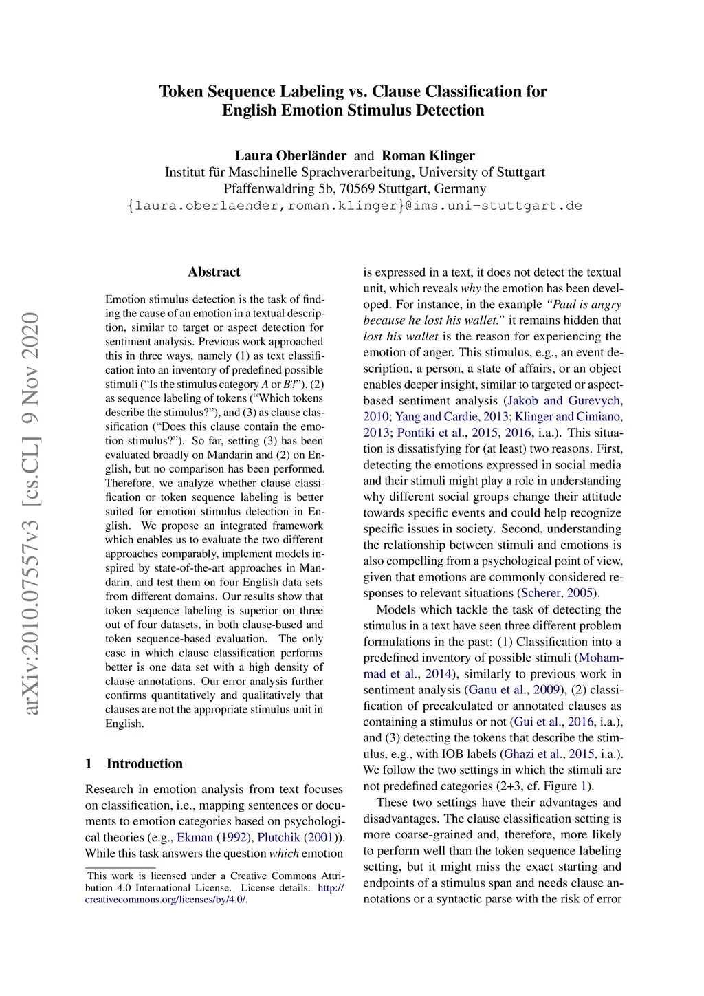 Token Sequence Labeling vs. Clause Classification for English Emotion