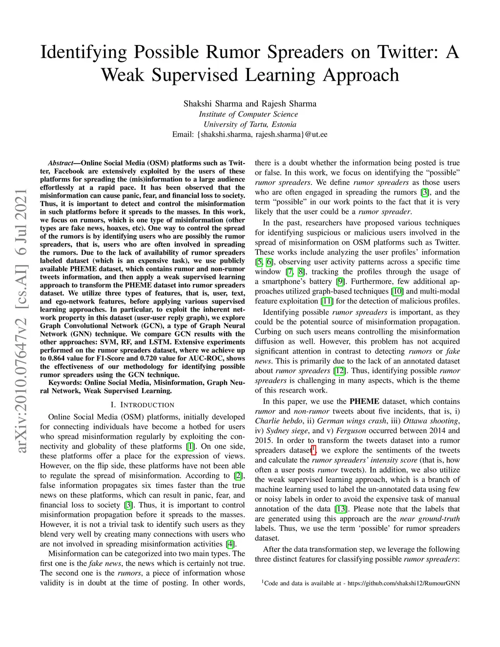 Online Social Media (OSM) platforms such as Twitter, Facebook are extensively exploited by the users of these platforms for spreading the (mis)information to a large audience effortlessly at a rapid pace. It has been observed that the misinformation can cause panic, fear, and financial loss to society. Thus, it is important to detect and control the misinformation in such platforms before it spreads to the masses. In this work, we focus on rumors, which is one type of misinformation (other types are fake news, hoaxes, etc). One way to control the spread of the rumors is by identifying users who are possibly the rumor spreaders, that is, users who are often involved in spreading the rumors. Due to the lack of availability of rumor spreaders labeled dataset (which is an expensive task), we use publicly available PHEME dataset, which contains rumor and non-rumor tweets information, and then apply a weak supervised learning approach to transform the PHEME dataset into rumor spreaders dataset. We utilize three types of features, that is, user, text, and ego-network features, before applying various supervised learning approaches. In particular, to exploit the inherent network property in this dataset (user-user reply graph), we explore Graph Convolutional Network (GCN), a type of Graph Neural Network (GNN) technique. We compare GCN results with the other approaches: SVM, RF, and LSTM. Extensive experiments performed on the rumor spreaders dataset, where we achieve up to 0.864 value for F1-Score and 0.720 value for AUC-ROC, shows the effectiveness of our methodology for identifying possible rumor spreaders using the GCN technique.