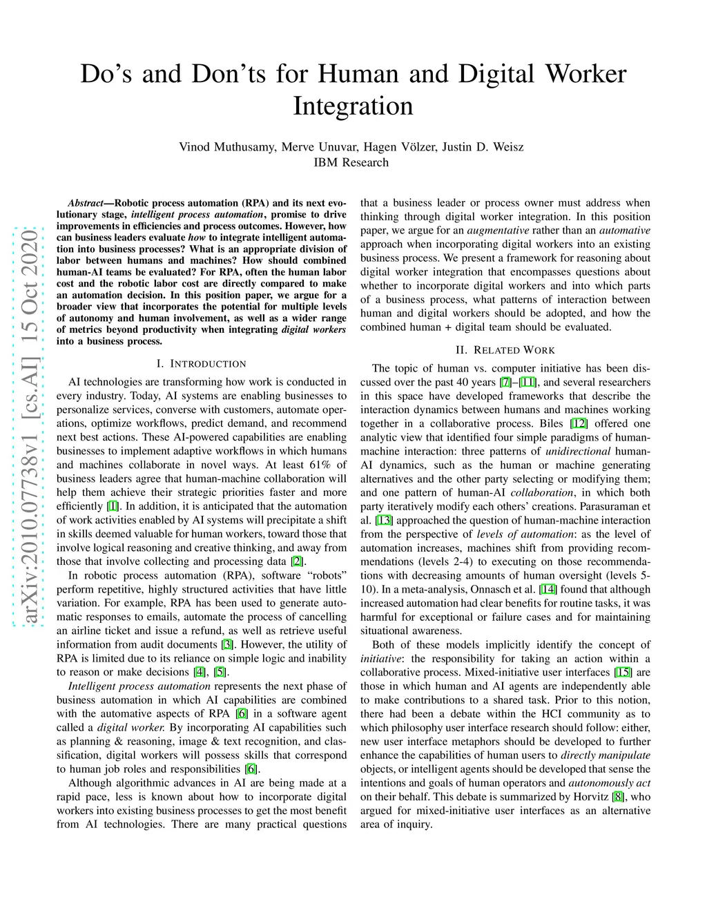Robotic process automation (RPA) and its next evolutionary stage, intelligent process automation, promise to drive improvements in efficiencies and process outcomes. However, how can business leaders evaluate how to integrate intelligent automation into business processes? What is an appropriate division of labor between humans and machines? How should combined human-AI teams be evaluated? For RPA, often the human labor cost and the robotic labor cost are directly compared to make an automation decision. In this position paper, we argue for a broader view that incorporates the potential for multiple levels of autonomy and human involvement, as well as a wider range of metrics beyond productivity when integrating digital workers into a business process