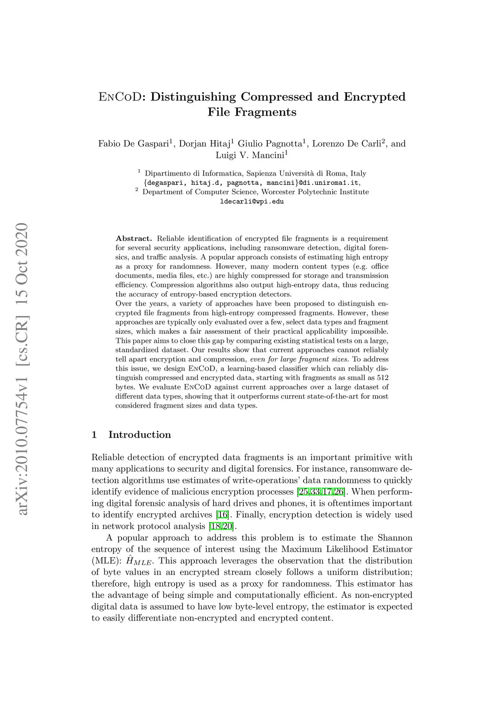 EnCoD: Distinguishing Compressed and Encrypted File Fragments