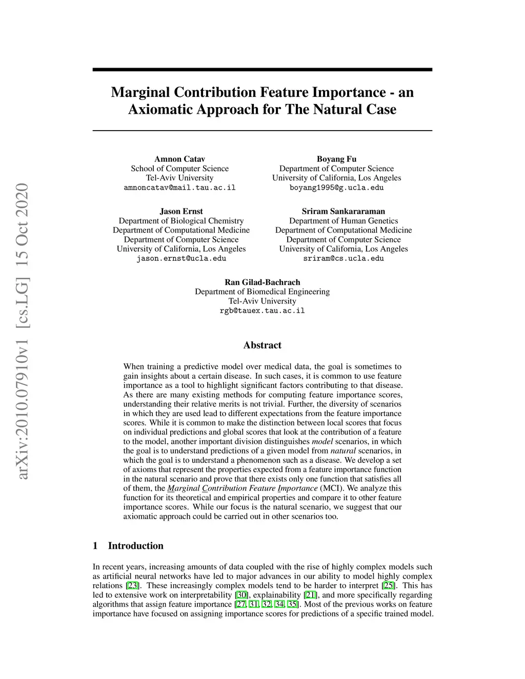 When training a predictive model over medical data, the goal is sometimes to gain insights about a certain disease. In such cases, it is common to use feature importance as a tool to highlight significant factors contributing to that disease. As there are many existing methods for computing feature importance scores, understanding their relative merits is not trivial. Further, the diversity of scenarios in which they are used lead to different expectations from the feature importance scores. While it is common to make the distinction between local scores that focus on individual predictions and global scores that look at the contribution of a feature to the model, another important division distinguishes model scenarios, in which the goal is to understand predictions of a given model from natural scenarios, in which the goal is to understand a phenomenon such as a disease. We develop a set of axioms that represent the properties expected from a feature importance function in the natural scenario and prove that there exists only one function that satisfies all of them, the Marginal Contribution Feature Importance (MCI). We analyze this function for its theoretical and empirical properties and compare it to other feature importance scores. While our focus is the natural scenario, we suggest that our axiomatic approach could be carried out in other scenarios too.