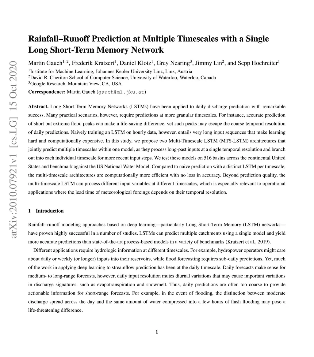 Long Short-Term Memory Networks (LSTMs) have been applied to daily discharge prediction with remarkable success. Many practical scenarios, however, require predictions at more granular timescales. For instance, accurate prediction of short but extreme flood peaks can make a life-saving difference, yet such peaks may escape the coarse temporal resolution of daily predictions. Naively training an LSTM on hourly data, however, entails very long input sequences that make learning hard and computationally expensive. In this study, we propose two Multi-Timescale LSTM (MTS-LSTM) architectures that jointly predict multiple timescales within one model, as they process long-past inputs at a single temporal resolution and branch out into each individual timescale for more recent input steps. We test these models on 516 basins across the continental United States and benchmark against the US National Water Model. Compared to naive prediction with a distinct LSTM per timescale, the multi-timescale architectures are computationally more efficient with no loss in accuracy. Beyond prediction quality, the multi-timescale LSTM can process different input variables at different timescales, which is especially relevant to operational applications where the lead time of meteorological forcings depends on their temporal resolution.