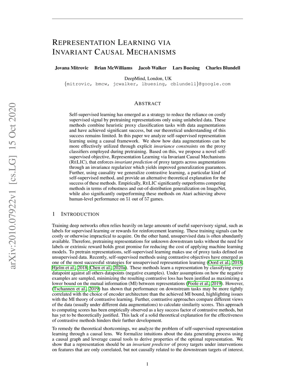 Self-supervised learning has emerged as a strategy to reduce the reliance on costly supervised signal by pretraining representations only using unlabeled data. These methods combine heuristic proxy classification tasks with data augmentations and have achieved significant success, but our theoretical understanding of this success remains limited. In this paper we analyze self-supervised representation learning using a causal framework. We show how data augmentations can be more effectively utilized through explicit invariance constraints on the proxy classifiers employed during pretraining. Based on this, we propose a novel self-supervised objective, Representation Learning via Invariant Causal Mechanisms (ReLIC), that enforces invariant prediction of proxy targets across augmentations through an invariance regularizer which yields improved generalization guarantees. Further, using causality we generalize contrastive learning, a particular kind of self-supervised method, and provide an alternative theoretical explanation for the success of these methods. Empirically, ReLIC significantly outperforms competing methods in terms of robustness and out-of-distribution generalization on ImageNet, while also significantly outperforming these methods on Atari achieving above human-level performance on out of games.
