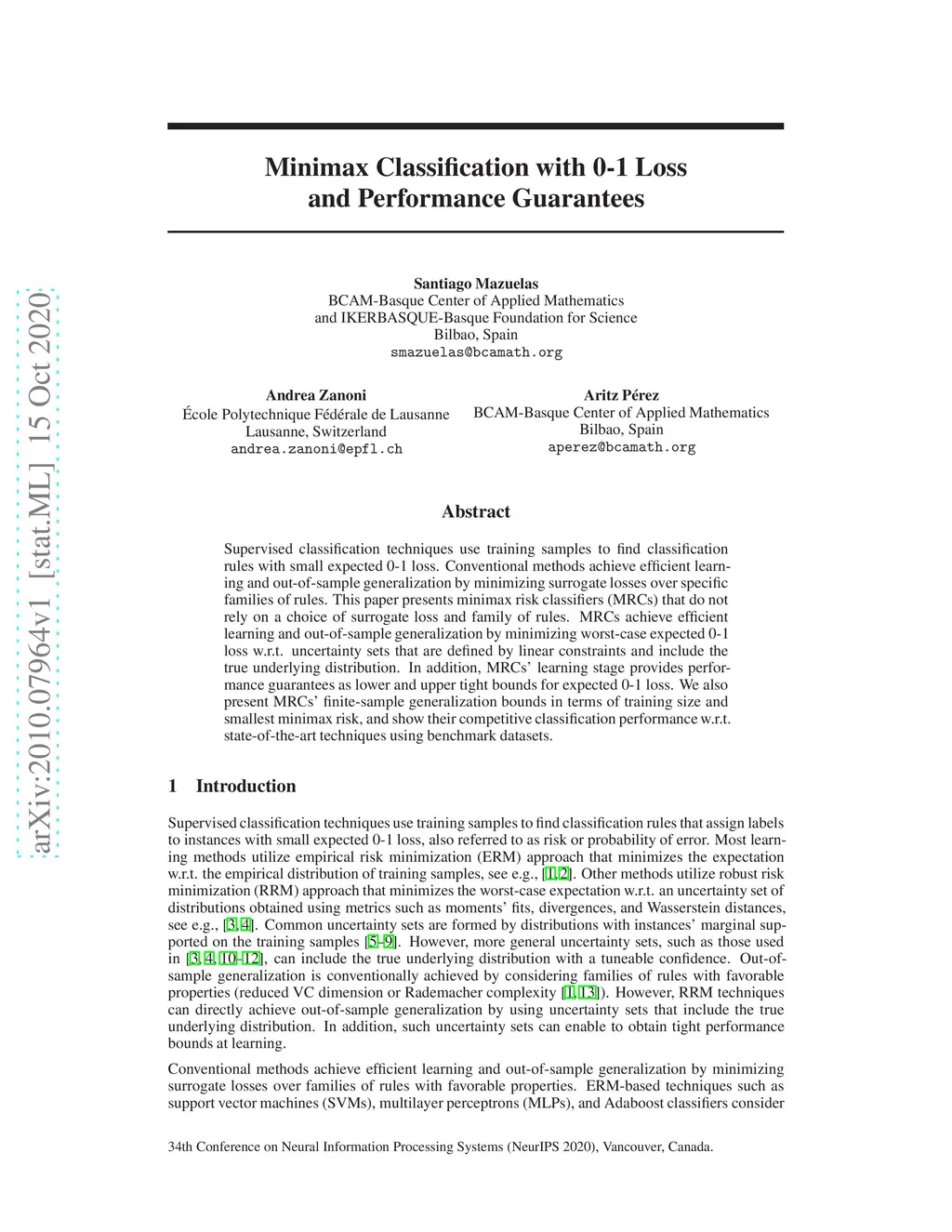Supervised classification techniques use training samples to find classification rules with small expected 0-1 loss. Conventional methods achieve efficient learning and out-of-sample generalization by minimizing surrogate losses over specific families of rules. This paper presents minimax risk classifiers (MRCs) that do not rely on a choice of surrogate loss and family of rules. MRCs achieve efficient learning and out-of-sample generalization by minimizing worst-case expected 0-1 loss w.r.t. uncertainty sets that are defined by linear constraints and include the true underlying distribution. In addition, MRCs' learning stage provides performance guarantees as lower and upper tight bounds for expected 0-1 loss. We also present MRCs' finite-sample generalization bounds in terms of training size and smallest minimax risk, and show their competitive classification performance w.r.t. state-of-the-art techniques using benchmark datasets.