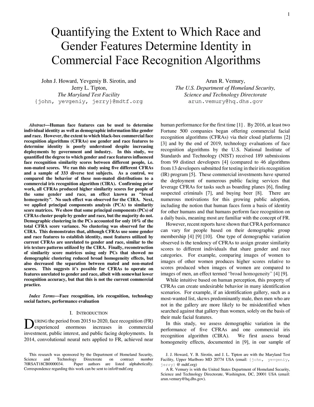 Human face features can be used to determine individual identity as well as demographic information like gender and race. However, the extent to which black-box commercial face recognition algorithms (CFRAs) use gender and race features to determine identity is poorly understood despite increasing deployments by government and industry. In this study, we quantified the degree to which gender and race features influenced face recognition similarity scores between different people, i.e. non-mated scores. We ran this study using five different CFRAs and a sample of 333 diverse test subjects. As a control, we compared the behavior of these non-mated distributions to a commercial iris recognition algorithm (CIRA). Confirming prior work, all CFRAs produced higher similarity scores for people of the same gender and race, an effect known as "broad homogeneity". No such effect was observed for the CIRA. Next, we applied principal components analysis (PCA) to similarity score matrices. We show that some principal components (PCs) of CFRAs cluster people by gender and race, but the majority do not. Demographic clustering in the PCs accounted for only 10 % of the total CFRA score variance. No clustering was observed for the CIRA. This demonstrates that, although CFRAs use some gender and race features to establish identity, most features utilized by current CFRAs are unrelated to gender and race, similar to the iris texture patterns utilized by the CIRA. Finally, reconstruction of similarity score matrices using only PCs that showed no demographic clustering reduced broad homogeneity effects, but also decreased the separation between mated and non-mated scores. This suggests it's possible for CFRAs to operate on features unrelated to gender and race, albeit with somewhat lower recognition accuracy, but that this is not the current commercial practice.