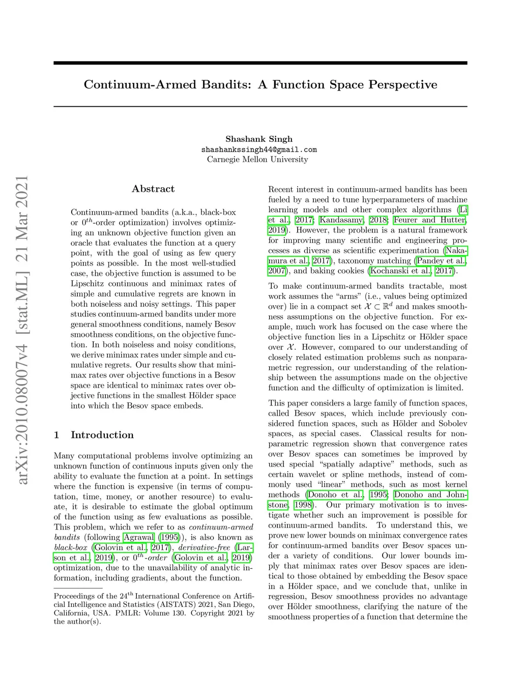 Continuum-armed bandits (a.k.a., black-box or -order optimization) involves optimizing an unknown objective function given an oracle that evaluates the function at a query point, with the goal of using as few query points as possible. In the most well-studied case, the objective function is assumed to be Lipschitz continuous and minimax rates of simple and cumulative regrets are known in both noiseless and noisy settings. This paper studies continuum-armed bandits under more general smoothness conditions, namely Besov smoothness conditions, on the objective function. In both noiseless and noisy conditions, we derive minimax rates under simple and cumulative regrets. Our results show that minimax rates over objective functions in a Besov space are identical to minimax rates over objective functions in the smallest H\"older space into which the Besov space embeds.