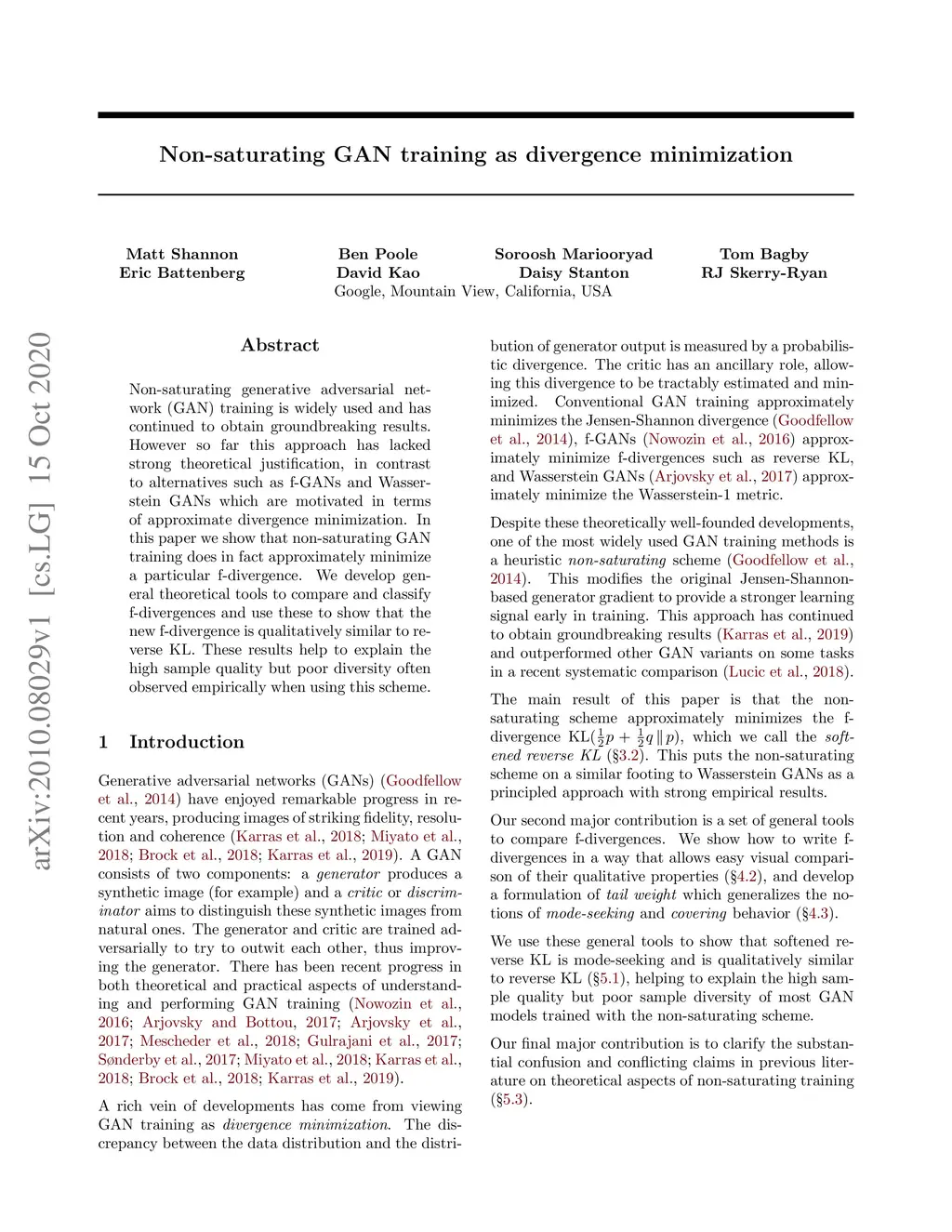 Non-saturating generative adversarial network (GAN) training is widely used and has continued to obtain groundbreaking results. However so far this approach has lacked strong theoretical justification, in contrast to alternatives such as f-GANs and Wasserstein GANs which are motivated in terms of approximate divergence minimization. In this paper we show that non-saturating GAN training does in fact approximately minimize a particular f-divergence. We develop general theoretical tools to compare and classify f-divergences and use these to show that the new f-divergence is qualitatively similar to reverse KL. These results help to explain the high sample quality but poor diversity often observed empirically when using this scheme.
