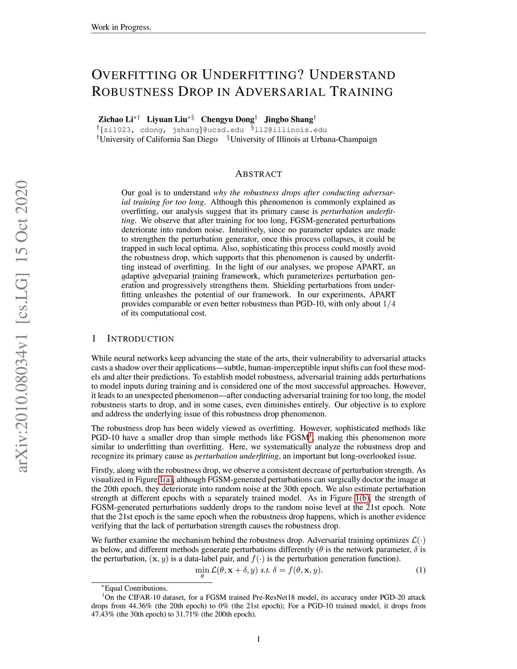 Our goal is to understand why the robustness drops after conducting adversarial training for too long. Although this phenomenon is commonly explained as overfitting, our analysis suggest that its primary cause is perturbation underfitting. We observe that after training for too long, FGSM-generated perturbations deteriorate into random noise. Intuitively, since no parameter updates are made to strengthen the perturbation generator, once this process collapses, it could be trapped in such local optima. Also, sophisticating this process could mostly avoid the robustness drop, which supports that this phenomenon is caused by underfitting instead of overfitting. In the light of our analyses, we propose APART, an adaptive adversarial training framework, which parameterizes perturbation generation and progressively strengthens them. Shielding perturbations from underfitting unleashes the potential of our framework. In our experiments, APART provides comparable or even better robustness than PGD-10, with only about 1/4 of its computational cost.