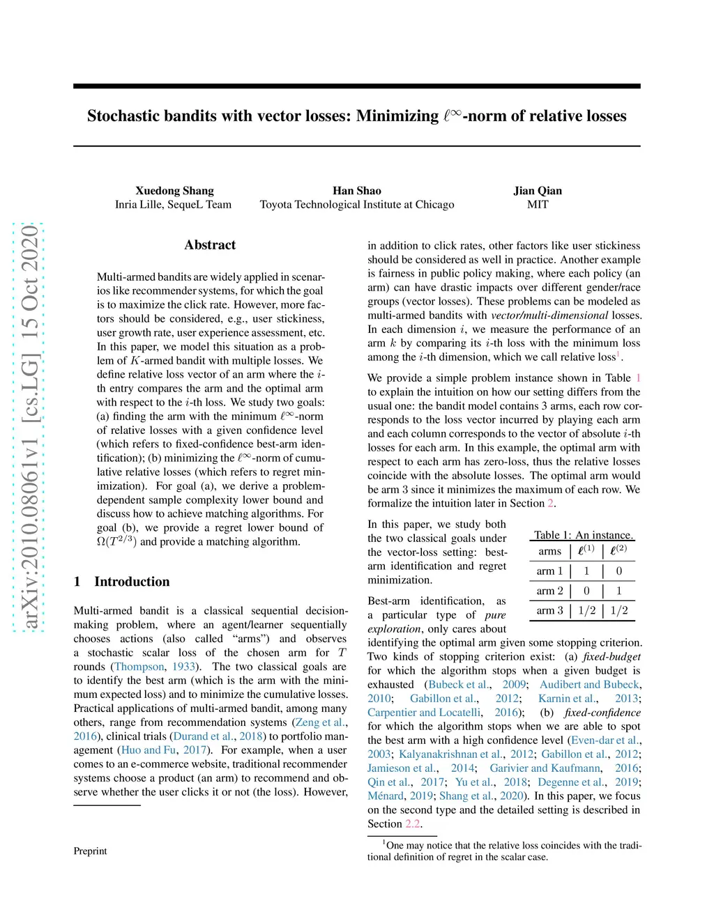 Multi-armed bandits are widely applied in scenarios like recommender systems, for which the goal is to maximize the click rate. However, more factors should be considered, e.g., user stickiness, user growth rate, user experience assessment, etc. In this paper, we model this situation as a problem of -armed bandit with multiple losses. We define relative loss vector of an arm where the -th entry compares the arm and the optimal arm with respect to the -th loss. We study two goals: (a) finding the arm with the minimum -norm of relative losses with a given confidence level (which refers to fixed-confidence best-arm identification); (b) minimizing the -norm of cumulative relative losses (which refers to regret minimization). For goal (a), we derive a problem-dependent sample complexity lower bound and discuss how to achieve matching algorithms. For goal (b), we provide a regret lower bound of and provide a matching algorithm.