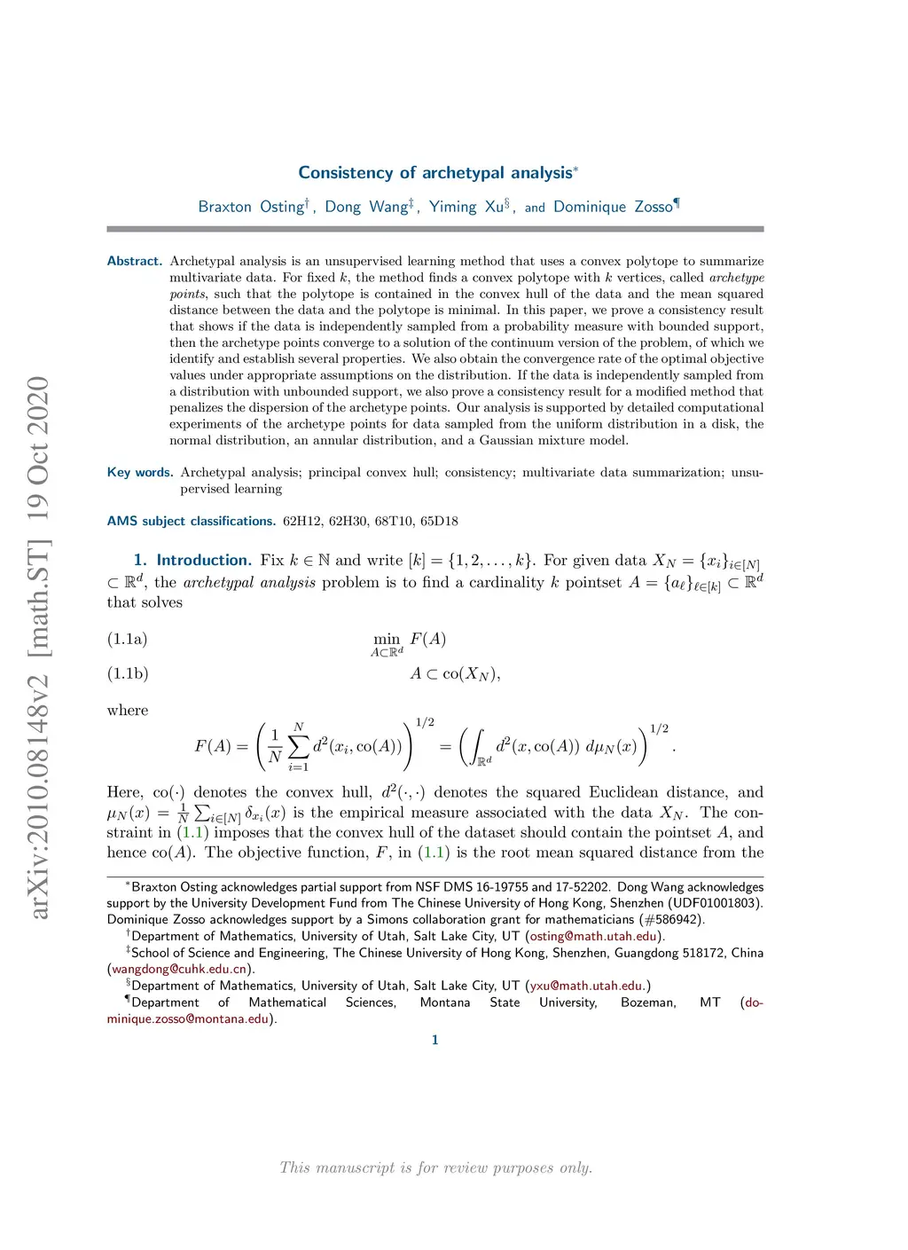 Archetypal analysis is an unsupervised learning method that uses a convex polytope to summarize multivariate data. For fixed , the method finds a convex polytope with vertices, called archetype points, such that the polytope is contained in the convex hull of the data and the mean squared distance between the data and the polytope is minimal. In this paper, we prove a consistency result that shows if the data is independently sampled from a probability measure with bounded support, then the archetype points converge to a solution of the continuum version of the problem, of which we identify and establish several properties. We also obtain the convergence rate of the optimal objective values under appropriate assumptions on the distribution. If the data is independently sampled from a distribution with unbounded support, we also prove a consistency result for a modified method that penalizes the dispersion of the archetype points. Our analysis is supported by detailed computational experiments of the archetype points for data sampled from the uniform distribution in a disk, the normal distribution, an annular distribution, and a Gaussian mixture model.