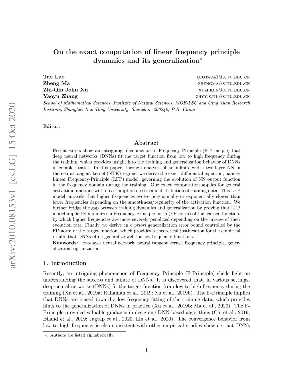 Recent works show an intriguing phenomenon of Frequency Principle (F-Principle) that deep neural networks (DNNs) fit the target function from low to high frequency during the training, which provides insight into the training and generalization behavior of DNNs in complex tasks. In this paper, through analysis of an infinite-width two-layer NN in the neural tangent kernel (NTK) regime, we derive the exact differential equation, namely Linear Frequency-Principle (LFP) model, governing the evolution of NN output function in the frequency domain during the training. Our exact computation applies for general activation functions with no assumption on size and distribution of training data. This LFP model unravels that higher frequencies evolve polynomially or exponentially slower than lower frequencies depending on the smoothness/regularity of the activation function. We further bridge the gap between training dynamics and generalization by proving that LFP model implicitly minimizes a Frequency-Principle norm (FP-norm) of the learned function, by which higher frequencies are more severely penalized depending on the inverse of their evolution rate. Finally, we derive an \textit{a priori} generalization error bound controlled by the FP-norm of the target function, which provides a theoretical justification for the empirical results that DNNs often generalize well for low frequency functions.