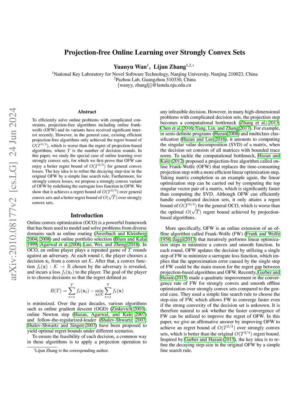 To efficiently solve online problems with complicated constraints, projection-free algorithms including online frank-wolfe (OFW) and its variants have received significant interest recently. However, in the general case, existing projection-free algorithms only achieved the regret bound of , which is worse than the regret of projection-based algorithms, where is the number of decision rounds. In this paper, we study the special case of online learning over strongly convex sets, for which we first prove that OFW enjoys a better regret bound of for general convex losses. The key idea is to refine the decaying step-size in the original OFW by a simple line search rule. Furthermore, for strongly convex losses, we propose a strongly convex variant of OFW by redefining the surrogate loss function in OFW. We show that it achieves a regret bound of over general convex sets and a better regret bound of over strongly convex sets.