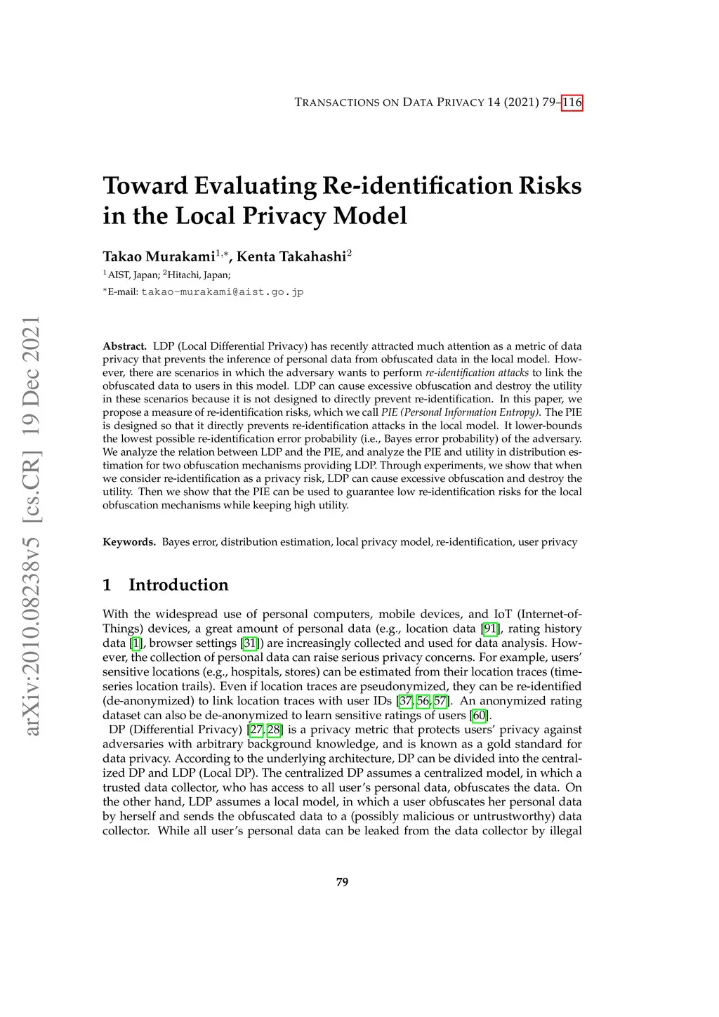 LDP (Local Differential Privacy) has recently attracted much attention as a metric of data privacy that prevents the inference of personal data from obfuscated data in the local model. However, there are scenarios in which the adversary wants to perform re-identification attacks to link the obfuscated data to users in this model. LDP can cause excessive obfuscation and destroy the utility in these scenarios because it is not designed to directly prevent re-identification. In this paper, we propose a measure of re-identification risks, which we call PIE (Personal Information Entropy). The PIE is designed so that it directly prevents re-identification attacks in the local model. It lower-bounds the lowest possible re-identification error probability (i.e., Bayes error probability) of the adversary. We analyze the relation between LDP and the PIE, and analyze the PIE and utility in distribution estimation for two obfuscation mechanisms providing LDP. Through experiments, we show that when we consider re-identification as a privacy risk, LDP can cause excessive obfuscation and destroy the utility. Then we show that the PIE can be used to guarantee low re-identification risks for the local obfuscation mechanisms while keeping high utility.