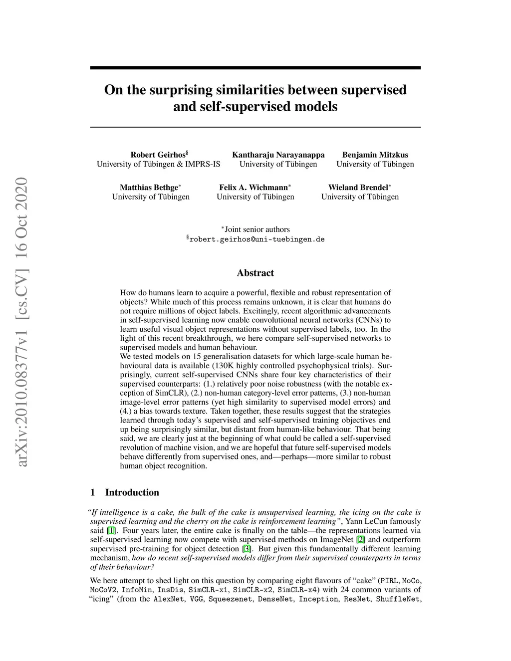 How do humans learn to acquire a powerful, flexible and robust representation of objects? While much of this process remains unknown, it is clear that humans do not require millions of object labels. Excitingly, recent algorithmic advancements in self-supervised learning now enable convolutional neural networks (CNNs) to learn useful visual object representations without supervised labels, too. In the light of this recent breakthrough, we here compare self-supervised networks to supervised models and human behaviour. We tested models on 15 generalisation datasets for which large-scale human behavioural data is available (130K highly controlled psychophysical trials). Surprisingly, current self-supervised CNNs share four key characteristics of their supervised counterparts: (1.) relatively poor noise robustness (with the notable exception of SimCLR), (2.) non-human category-level error patterns, (3.) non-human image-level error patterns (yet high similarity to supervised model errors) and (4.) a bias towards texture. Taken together, these results suggest that the strategies learned through today's supervised and self-supervised training objectives end up being surprisingly similar, but distant from human-like behaviour. That being said, we are clearly just at the beginning of what could be called a self-supervised revolution of machine vision, and we are hopeful that future self-supervised models behave differently from supervised ones, and---perhaps---more similar to robust human object recognition.