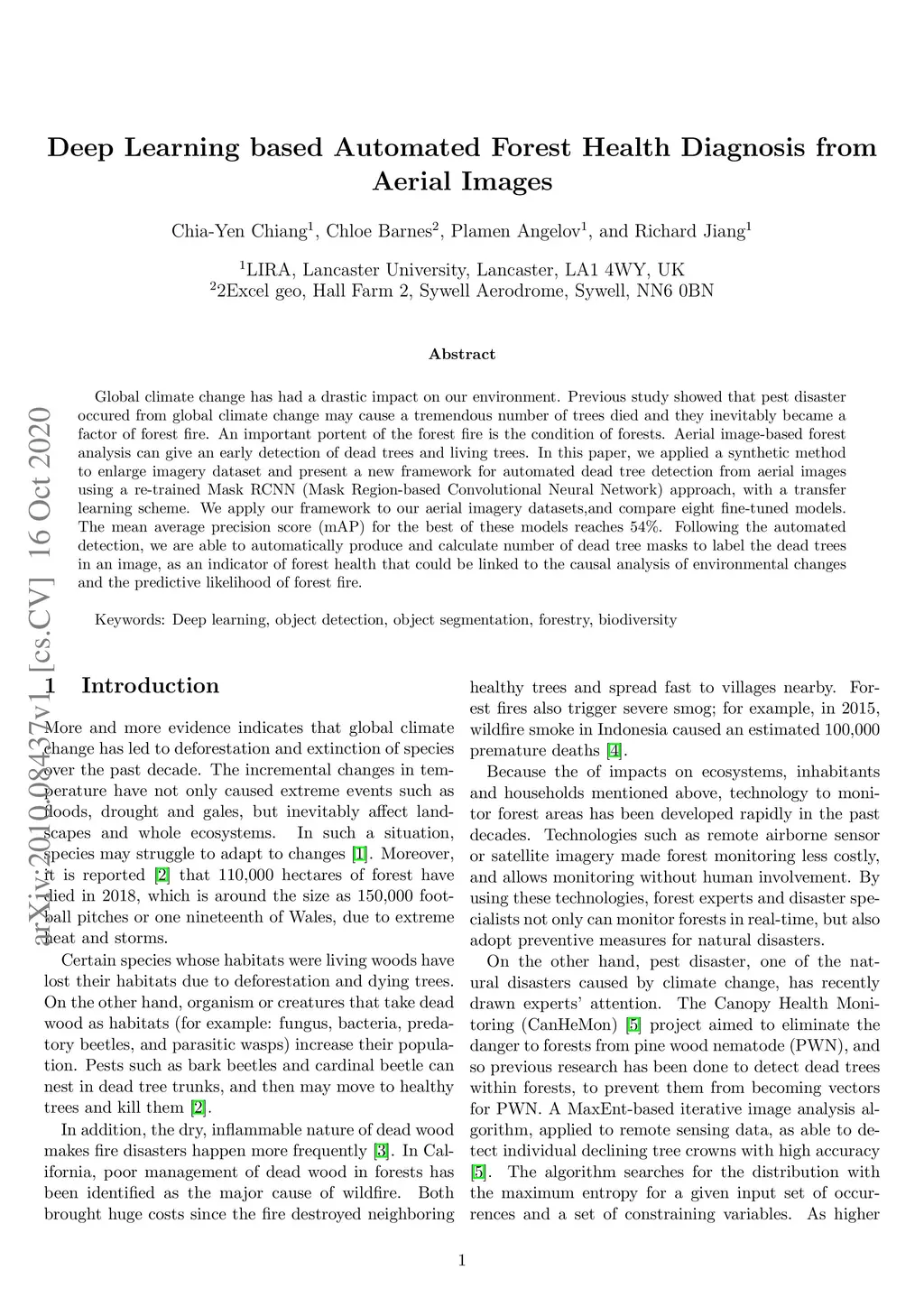 Global climate change has had a drastic impact on our environment. Previous study showed that pest disaster occured from global climate change may cause a tremendous number of trees died and they inevitably became a factor of forest fire. An important portent of the forest fire is the condition of forests. Aerial image-based forest analysis can give an early detection of dead trees and living trees. In this paper, we applied a synthetic method to enlarge imagery dataset and present a new framework for automated dead tree detection from aerial images using a re-trained Mask RCNN (Mask Region-based Convolutional Neural Network) approach, with a transfer learning scheme. We apply our framework to our aerial imagery datasets,and compare eight fine-tuned models. The mean average precision score (mAP) for the best of these models reaches 54%. Following the automated detection, we are able to automatically produce and calculate number of dead tree masks to label the dead trees in an image, as an indicator of forest health that could be linked to the causal analysis of environmental changes and the predictive likelihood of forest fire.