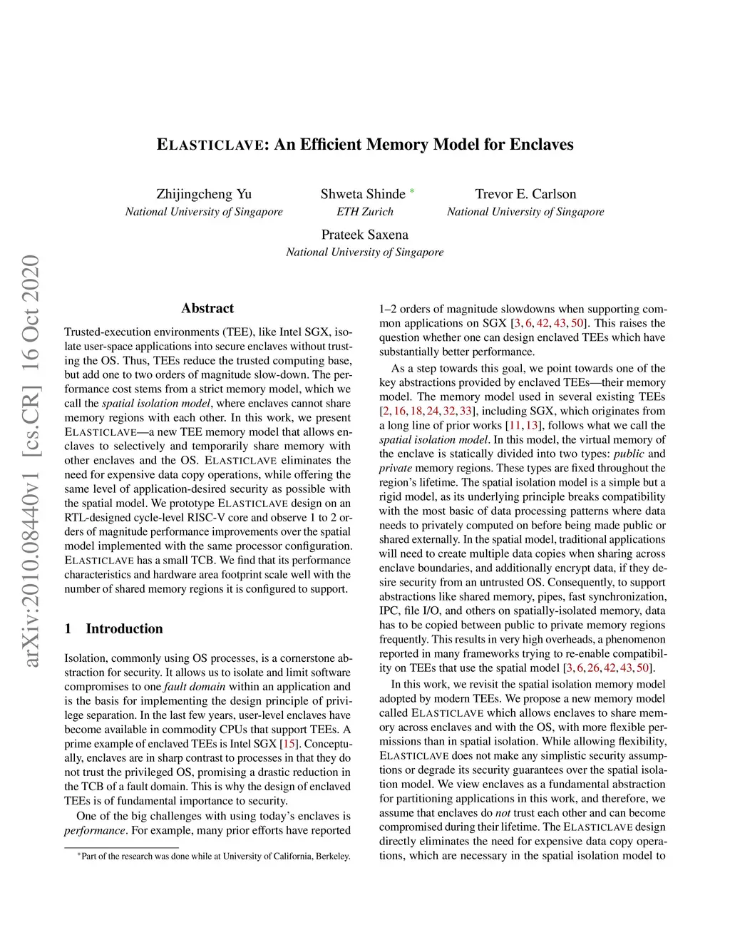 Trusted-execution environments (TEE), like Intel SGX, isolate user-space applications into secure enclaves without trusting the OS. Thus, TEEs reduce the trusted computing base, but add one to two orders of magnitude slow-down. The performance cost stems from a strict memory model, which we call the spatial isolation model, where enclaves cannot share memory regions with each other. In this work, we present Elasticlave---a new TEE memory model that allows enclaves to selectively and temporarily share memory with other enclaves and the OS. Elasticlave eliminates the need for expensive data copy operations, while offering the same level of application-desired security as possible with the spatial model. We prototype Elasticlave design on an RTL-designed cycle-level RISC-V core and observe 1 to 2 orders of magnitude performance improvements over the spatial model implemented with the same processor configuration. Elasticlave has a small TCB. We find that its performance characteristics and hardware area footprint scale well with the number of shared memory regions it is configured to support.