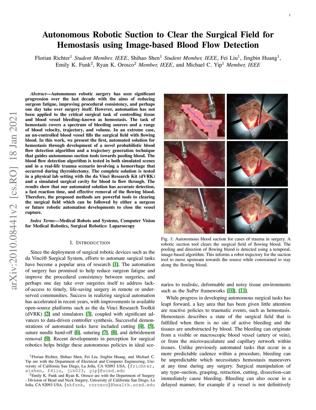 Autonomous robotic surgery has seen significant progression over the last decade with the aims of reducing surgeon fatigue, improving procedural consistency, and perhaps one day take over surgery itself. However, automation has not been applied to the critical surgical task of controlling tissue and blood vessel bleeding--known as hemostasis. The task of hemostasis covers a spectrum of bleeding sources and a range of blood velocity, trajectory, and volume. In an extreme case, an un-controlled blood vessel fills the surgical field with flowing blood. In this work, we present the first, automated solution for hemostasis through development of a novel probabilistic blood flow detection algorithm and a trajectory generation technique that guides autonomous suction tools towards pooling blood. The blood flow detection algorithm is tested in both simulated scenes and in a real-life trauma scenario involving a hemorrhage that occurred during thyroidectomy. The complete solution is tested in a physical lab setting with the da Vinci Research Kit (dVRK) and a simulated surgical cavity for blood to flow through. The results show that our automated solution has accurate detection, a fast reaction time, and effective removal of the flowing blood. Therefore, the proposed methods are powerful tools to clearing the surgical field which can be followed by either a surgeon or future robotic automation developments to close the vessel rupture.