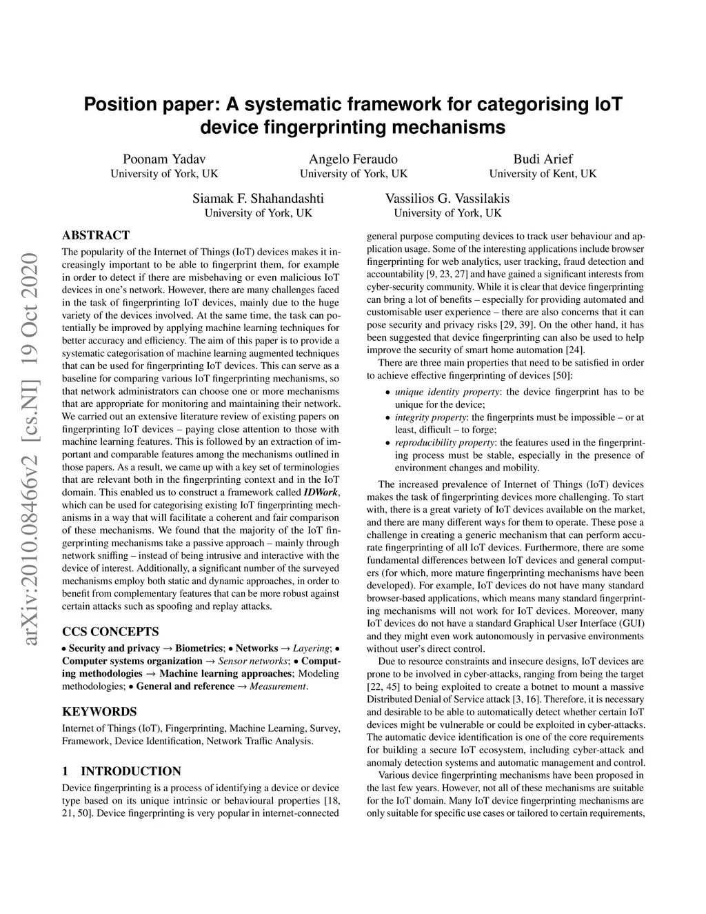 The popularity of the Internet of Things (IoT) devices makes it increasingly important to be able to fingerprint them, for example in order to detect if there are misbehaving or even malicious IoT devices in one's network. The aim of this paper is to provide a systematic categorisation of machine learning augmented techniques that can be used for fingerprinting IoT devices. This can serve as a baseline for comparing various IoT fingerprinting mechanisms, so that network administrators can choose one or more mechanisms that are appropriate for monitoring and maintaining their network. We carried out an extensive literature review of existing papers on fingerprinting IoT devices -- paying close attention to those with machine learning features. This is followed by an extraction of important and comparable features among the mechanisms outlined in those papers. As a result, we came up with a key set of terminologies that are relevant both in the fingerprinting context and in the IoT domain. This enabled us to construct a framework called IDWork, which can be used for categorising existing IoT fingerprinting mechanisms in a way that will facilitate a coherent and fair comparison of these mechanisms. We found that the majority of the IoT fingerprinting mechanisms take a passive approach -- mainly through network sniffing -- instead of being intrusive and interactive with the device of interest. Additionally, a significant number of the surveyed mechanisms employ both static and dynamic approaches, in order to benefit from complementary features that can be more robust against certain attacks such as spoofing and replay attacks.