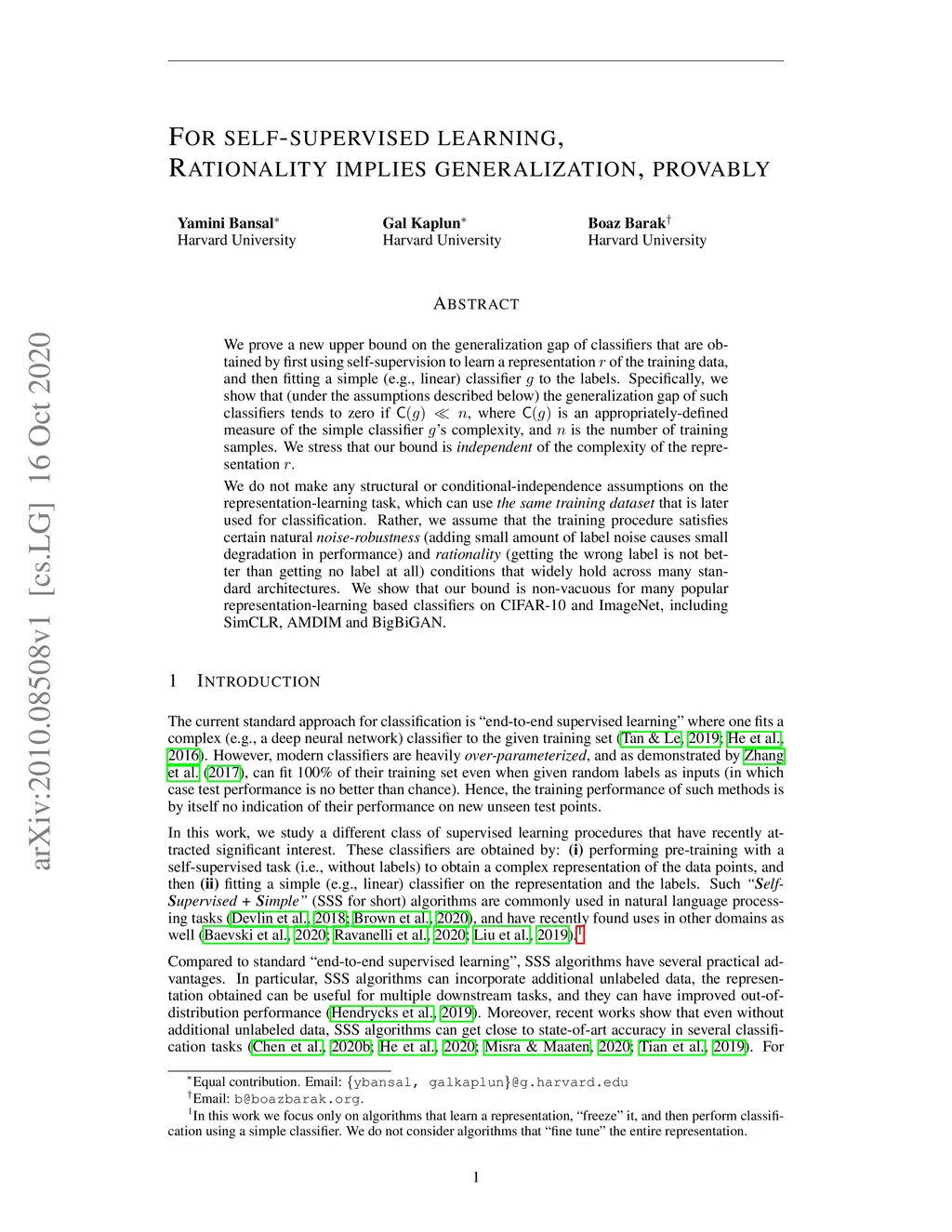 We prove a new upper bound on the generalization gap of classifiers that are obtained by first using self-supervision to learn a representation of the training data, and then fitting a simple (e.g., linear) classifier to the labels. Specifically, we show that (under the assumptions described below) the generalization gap of such classifiers tends to zero if , where is an appropriately-defined measure of the simple classifier 's complexity, and is the number of training samples. We stress that our bound is independent of the complexity of the representation . We do not make any structural or conditional-independence assumptions on the representation-learning task, which can use the same training dataset that is later used for classification. Rather, we assume that the training procedure satisfies certain natural noise-robustness (adding small amount of label noise causes small degradation in performance) and rationality (getting the wrong label is not better than getting no label at all) conditions that widely hold across many standard architectures. We show that our bound is non-vacuous for many popular representation-learning based classifiers on CIFAR-10 and ImageNet, including SimCLR, AMDIM and MoCo.