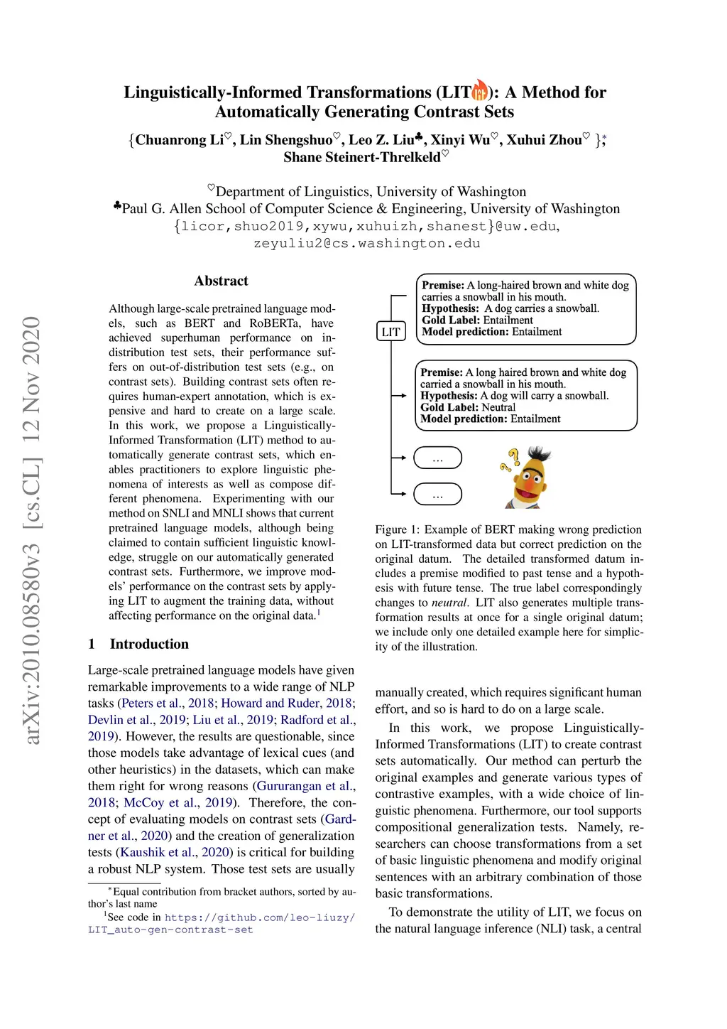 Although large-scale pretrained language models, such as BERT and RoBERTa, have achieved superhuman performance on in-distribution test sets, their performance suffers on out-of-distribution test sets (e.g., on contrast sets). Building contrast sets often re-quires human-expert annotation, which is expensive and hard to create on a large scale. In this work, we propose a Linguistically-Informed Transformation (LIT) method to automatically generate contrast sets, which enables practitioners to explore linguistic phenomena of interests as well as compose different phenomena. Experimenting with our method on SNLI and MNLI shows that current pretrained language models, although being claimed to contain sufficient linguistic knowledge, struggle on our automatically generated contrast sets. Furthermore, we improve models' performance on the contrast sets by apply-ing LIT to augment the training data, without affecting performance on the original data.