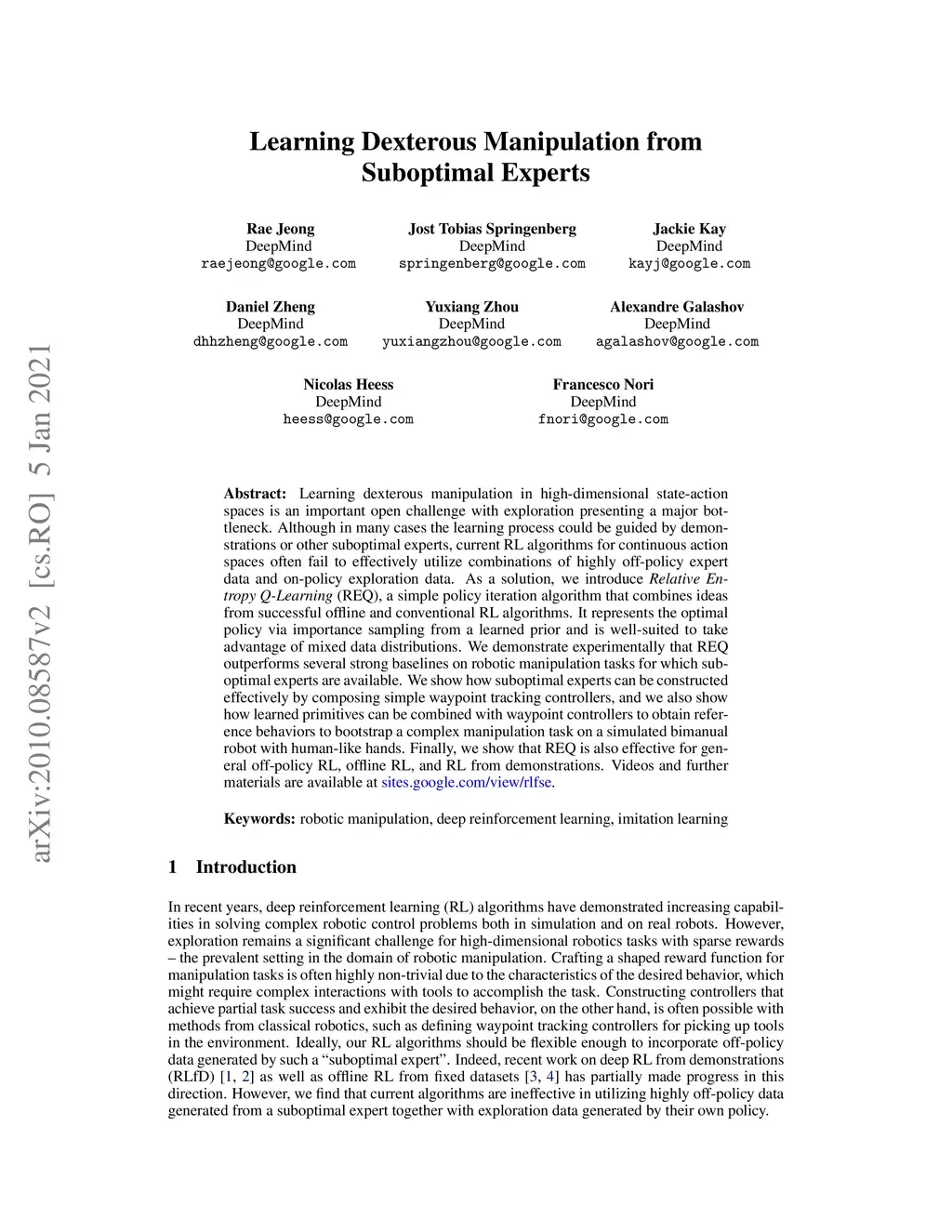 Learning dexterous manipulation in high-dimensional state-action spaces is an important open challenge with exploration presenting a major bottleneck. Although in many cases the learning process could be guided by demonstrations or other suboptimal experts, current RL algorithms for continuous action spaces often fail to effectively utilize combinations of highly off-policy expert data and on-policy exploration data. As a solution, we introduce Relative Entropy Q-Learning (REQ), a simple policy iteration algorithm that combines ideas from successful offline and conventional RL algorithms. It represents the optimal policy via importance sampling from a learned prior and is well-suited to take advantage of mixed data distributions. We demonstrate experimentally that REQ outperforms several strong baselines on robotic manipulation tasks for which suboptimal experts are available. We show how suboptimal experts can be constructed effectively by composing simple waypoint tracking controllers, and we also show how learned primitives can be combined with waypoint controllers to obtain reference behaviors to bootstrap a complex manipulation task on a simulated bimanual robot with human-like hands. Finally, we show that REQ is also effective for general off-policy RL, offline RL, and RL from demonstrations. Videos and further materials are available at sites.google.com/view/rlfse.