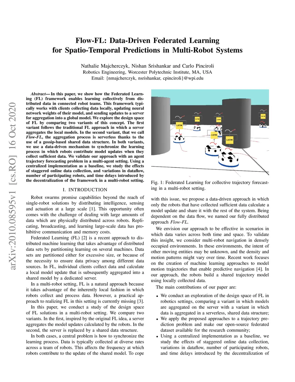 In this paper, we show how the Federated Learning (FL) framework enables learning collectively from distributed data in connected robot teams. This framework typically works with clients collecting data locally, updating neural network weights of their model, and sending updates to a server for aggregation into a global model. We explore the design space of FL by comparing two variants of this concept. The first variant follows the traditional FL approach in which a server aggregates the local models. In the second variant, that we call Flow-FL, the aggregation process is serverless thanks to the use of a gossip-based shared data structure. In both variants, we use a data-driven mechanism to synchronize the learning process in which robots contribute model updates when they collect sufficient data. We validate our approach with an agent trajectory forecasting problem in a multi-agent setting. Using a centralized implementation as a baseline, we study the effects of staggered online data collection, and variations in data flow, number of participating robots, and time delays introduced by the decentralization of the framework in a multi-robot setting.