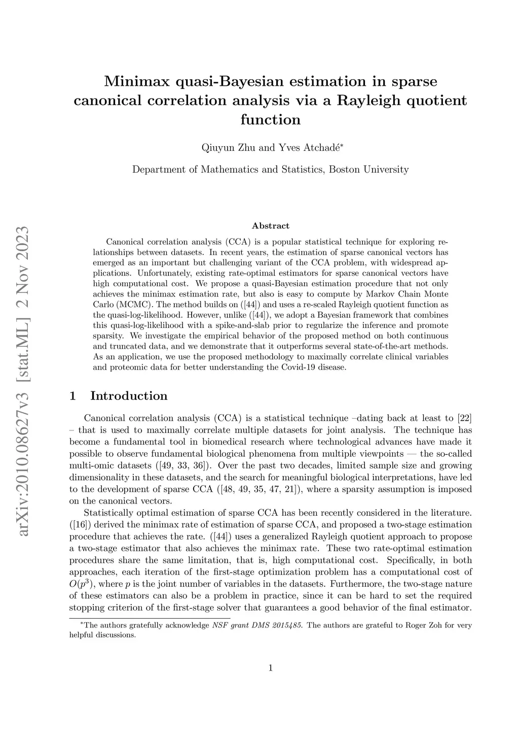 Canonical correlation analysis (CCA) is a popular statistical technique for exploring the relationship between datasets. The estimation of sparse canonical correlation vectors has emerged in recent years as an important but challenging variation of the CCA problem, with widespread applications. Currently available rate-optimal estimators for sparse canonical correlation vectors are expensive to compute. We propose a quasi-Bayesian estimation procedure that achieves the minimax estimation rate, and yet is easy to compute by Markov Chain Monte Carlo (MCMC). The method builds on ([37]) and uses a re-scaled Rayleigh quotient function as a quasi-log-likelihood. However unlike these authors, we adopt a Bayesian framework that combines this quasi-log-likelihood with a spike-and-slab prior that serves to regularize the inference and promote sparsity. We investigated the empirical behavior of the proposed method on both continuous and truncated data, and we noted that it outperforms several state-of-the-art methods. As an application, we use the methodology to maximally correlate clinical variables and proteomic data for a better understanding of covid-19 disease.
