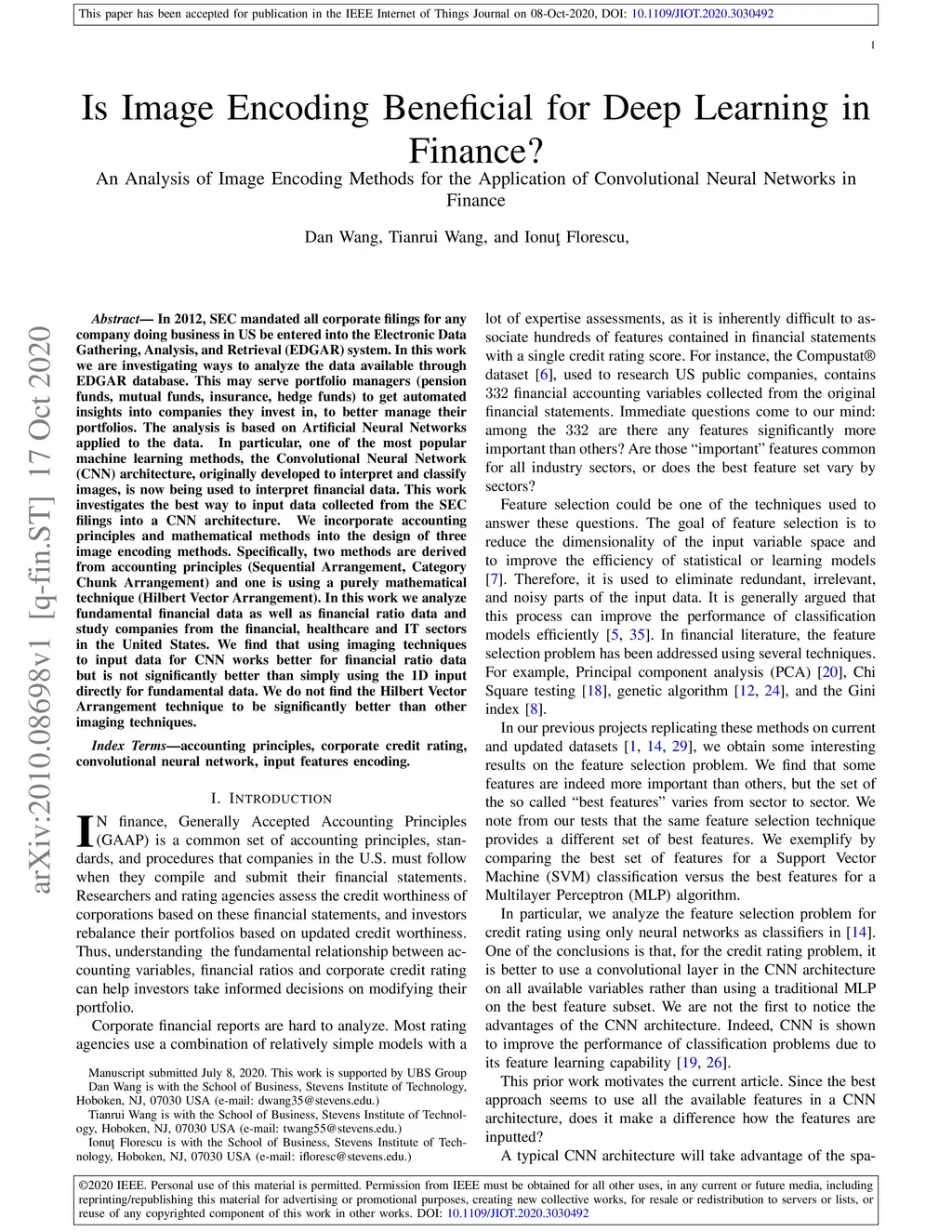 In 2012, SEC mandated all corporate filings for any company doing business in US be entered into the Electronic Data Gathering, Analysis, and Retrieval (EDGAR) system. In this work we are investigating ways to analyze the data available through EDGAR database. This may serve portfolio managers (pension funds, mutual funds, insurance, hedge funds) to get automated insights into companies they invest in, to better manage their portfolios. The analysis is based on Artificial Neural Networks applied to the data.} In particular, one of the most popular machine learning methods, the Convolutional Neural Network (CNN) architecture, originally developed to interpret and classify images, is now being used to interpret financial data. This work investigates the best way to input data collected from the SEC filings into a CNN architecture. We incorporate accounting principles and mathematical methods into the design of three image encoding methods. Specifically, two methods are derived from accounting principles (Sequential Arrangement, Category Chunk Arrangement) and one is using a purely mathematical technique (Hilbert Vector Arrangement). In this work we analyze fundamental financial data as well as financial ratio data and study companies from the financial, healthcare and IT sectors in the United States. We find that using imaging techniques to input data for CNN works better for financial ratio data but is not significantly better than simply using the 1D input directly for fundamental data. We do not find the Hilbert Vector Arrangement technique to be significantly better than other imaging techniques.