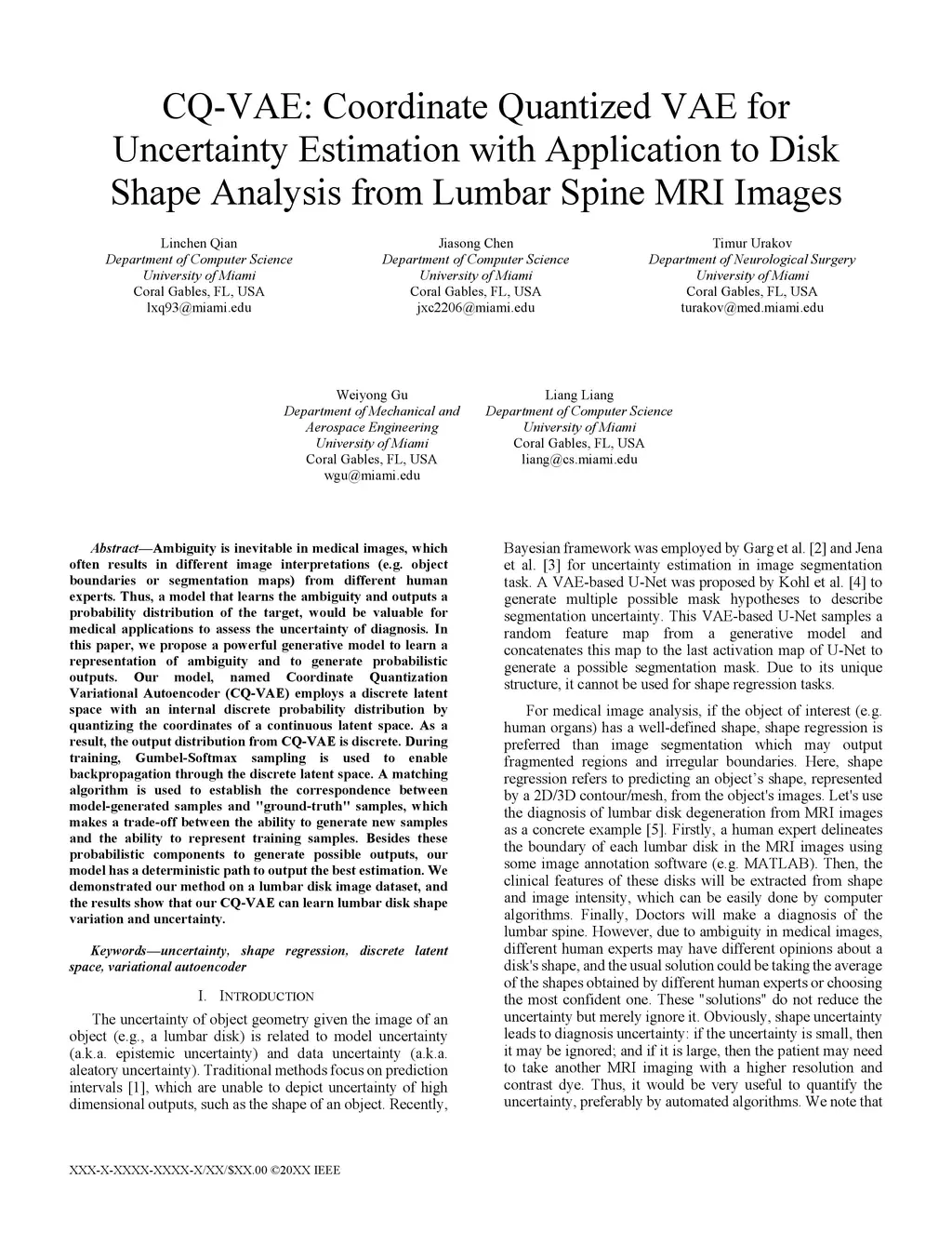 Ambiguity is inevitable in medical images, which often results in different image interpretations (e.g. object boundaries or segmentation maps) from different human experts. Thus, a model that learns the ambiguity and outputs a probability distribution of the target, would be valuable for medical applications to assess the uncertainty of diagnosis. In this paper, we propose a powerful generative model to learn a representation of ambiguity and to generate probabilistic outputs. Our model, named Coordinate Quantization Variational Autoencoder (CQ-VAE) employs a discrete latent space with an internal discrete probability distribution by quantizing the coordinates of a continuous latent space. As a result, the output distribution from CQ-VAE is discrete. During training, Gumbel-Softmax sampling is used to enable backpropagation through the discrete latent space. A matching algorithm is used to establish the correspondence between model-generated samples and "ground-truth" samples, which makes a trade-off between the ability to generate new samples and the ability to represent training samples. Besides these probabilistic components to generate possible outputs, our model has a deterministic path to output the best estimation. We demonstrated our method on a lumbar disk image dataset, and the results show that our CQ-VAE can learn lumbar disk shape variation and uncertainty.