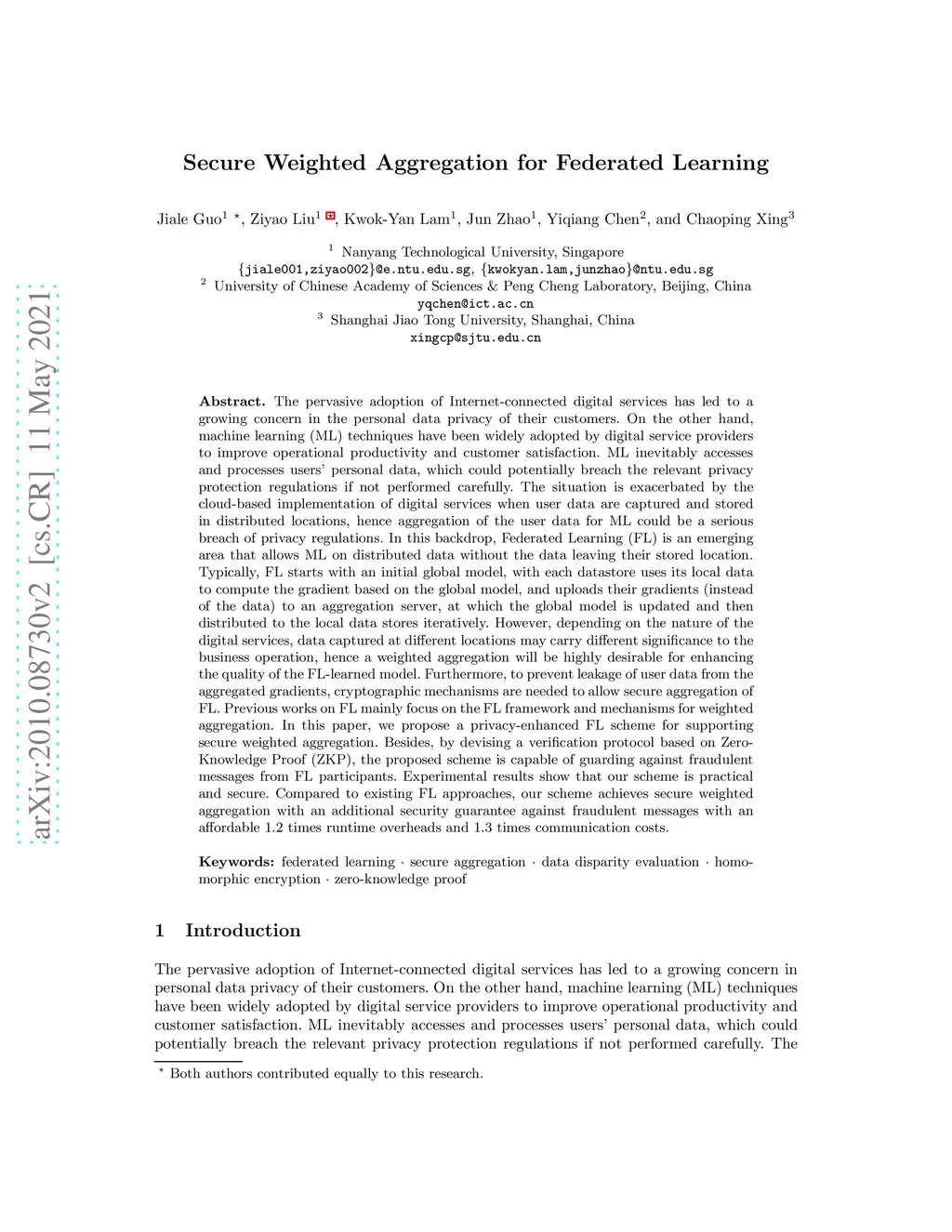 The pervasive adoption of Internet-connected digital services has led to a growing concern in the personal data privacy of their customers. On the other hand, machine learning (ML) techniques have been widely adopted by digital service providers to improve operational productivity and customer satisfaction. ML inevitably accesses and processes users' personal data, which could potentially breach the relevant privacy protection regulations if not performed carefully. The situation is exacerbated by the cloud-based implementation of digital services when user data are captured and stored in distributed locations, hence aggregation of the user data for ML could be a serious breach of privacy regulations. In this backdrop, Federated Learning (FL) is an emerging area that allows ML on distributed data without the data leaving their stored location. However, depending on the nature of the digital services, data captured at different locations may carry different significance to the business operation, hence a weighted aggregation will be highly desirable for enhancing the quality of the FL-learned model. Furthermore, to prevent leakage of user data from the aggregated gradients, cryptographic mechanisms are needed to allow secure aggregation of FL. In this paper, we propose a privacy-enhanced FL scheme for supporting secure weighted aggregation. Besides, by devising a verification protocol based on Zero-Knowledge Proof (ZKP), the proposed scheme is capable of guarding against fraudulent messages from FL participants. Experimental results show that our scheme is practical and secure. Compared to existing FL approaches, our scheme achieves secure weighted aggregation with an additional security guarantee against fraudulent messages with an affordable 1.2 times runtime overheads and 1.3 times communication costs.