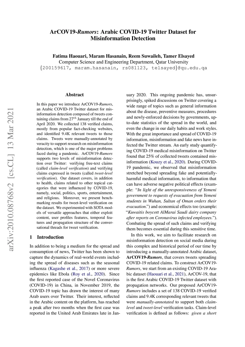 ArCOV19-Rumors: Arabic COVID-19 Twitter Dataset for Misinformation