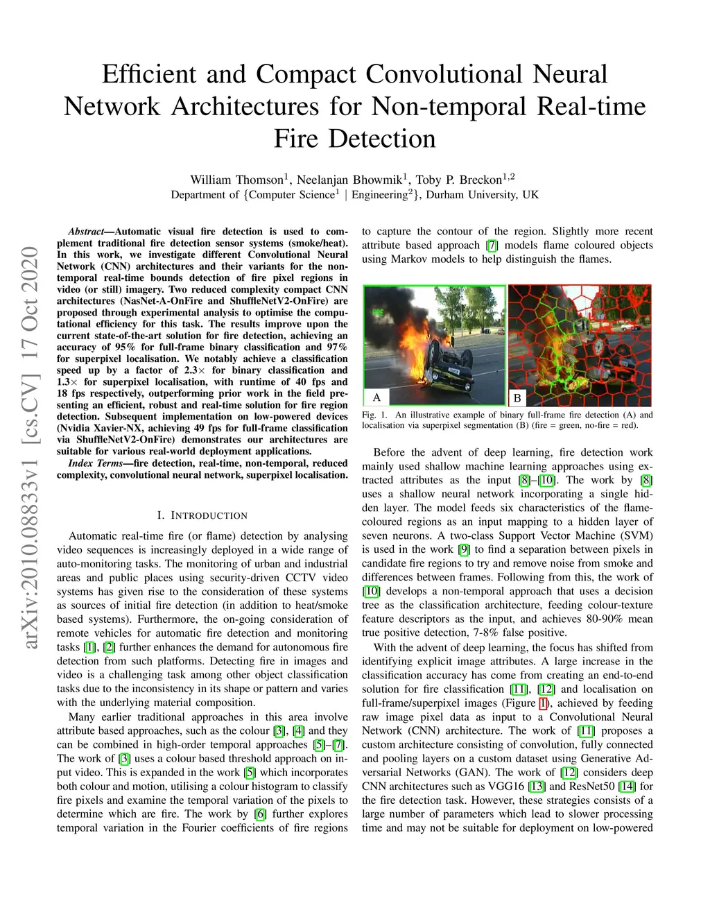 Automatic visual fire detection is used to complement traditional fire detection sensor systems (smoke/heat). In this work, we investigate different Convolutional Neural Network (CNN) architectures and their variants for the non-temporal real-time bounds detection of fire pixel regions in video (or still) imagery. Two reduced complexity compact CNN architectures (NasNet-A-OnFire and ShuffleNetV2-OnFire) are proposed through experimental analysis to optimise the computational efficiency for this task. The results improve upon the current state-of-the-art solution for fire detection, achieving an accuracy of 95% for full-frame binary classification and 97% for superpixel localisation. We notably achieve a classification speed up by a factor of 2.3x for binary classification and 1.3x for superpixel localisation, with runtime of 40 fps and 18 fps respectively, outperforming prior work in the field presenting an efficient, robust and real-time solution for fire region detection. Subsequent implementation on low-powered devices (Nvidia Xavier-NX, achieving 49 fps for full-frame classification via ShuffleNetV2-OnFire) demonstrates our architectures are suitable for various real-world deployment applications.