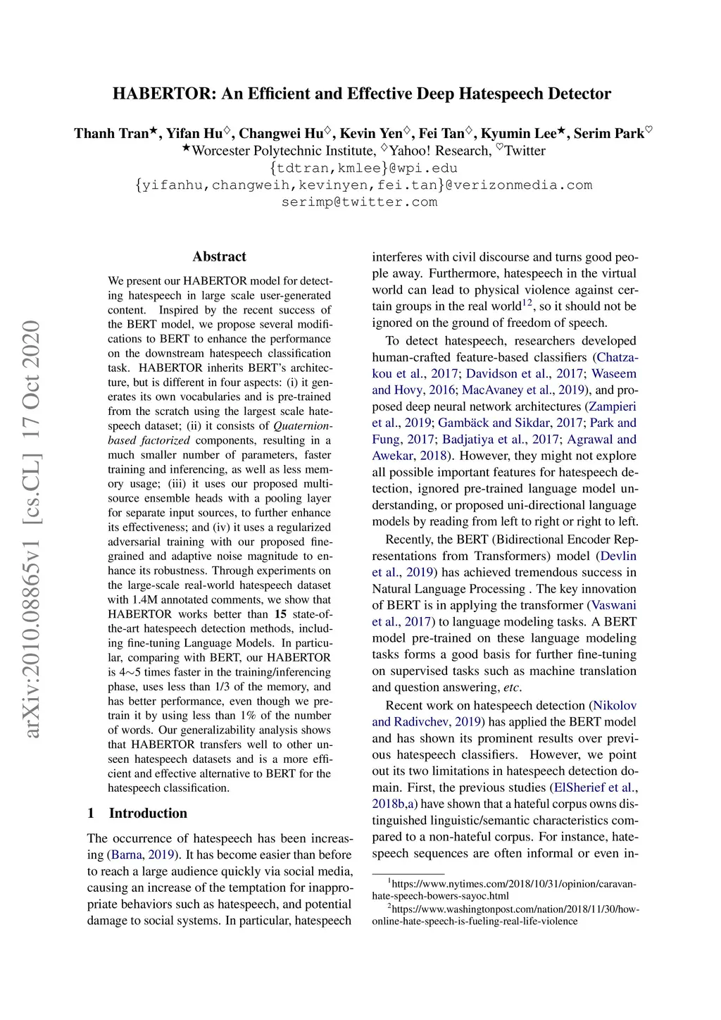 HABERTOR: An Efficient and Effective Deep Hatespeech Detector