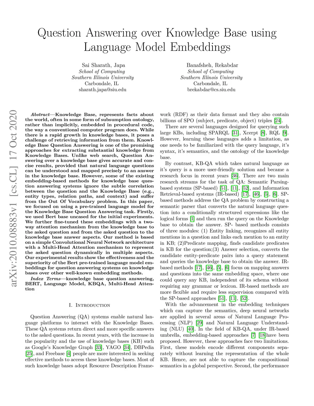 Knowledge Base, represents facts about the world, often in some form of subsumption ontology, rather than implicitly, embedded in procedural code, the way a conventional computer program does. While there is a rapid growth in knowledge bases, it poses a challenge of retrieving information from them. Knowledge Base Question Answering is one of the promising approaches for extracting substantial knowledge from Knowledge Bases. Unlike web search, Question Answering over a knowledge base gives accurate and concise results, provided that natural language questions can be understood and mapped precisely to an answer in the knowledge base. However, some of the existing embedding-based methods for knowledge base question answering systems ignore the subtle correlation between the question and the Knowledge Base (e.g., entity types, relation paths, and context) and suffer from the Out Of Vocabulary problem. In this paper, we focused on using a pre-trained language model for the Knowledge Base Question Answering task. Firstly, we used Bert base uncased for the initial experiments. We further fine-tuned these embeddings with a two-way attention mechanism from the knowledge base to the asked question and from the asked question to the knowledge base answer aspects. Our method is based on a simple Convolutional Neural Network architecture with a Multi-Head Attention mechanism to represent the asked question dynamically in multiple aspects. Our experimental results show the effectiveness and the superiority of the Bert pre-trained language model embeddings for question answering systems on knowledge bases over other well-known embedding methods.