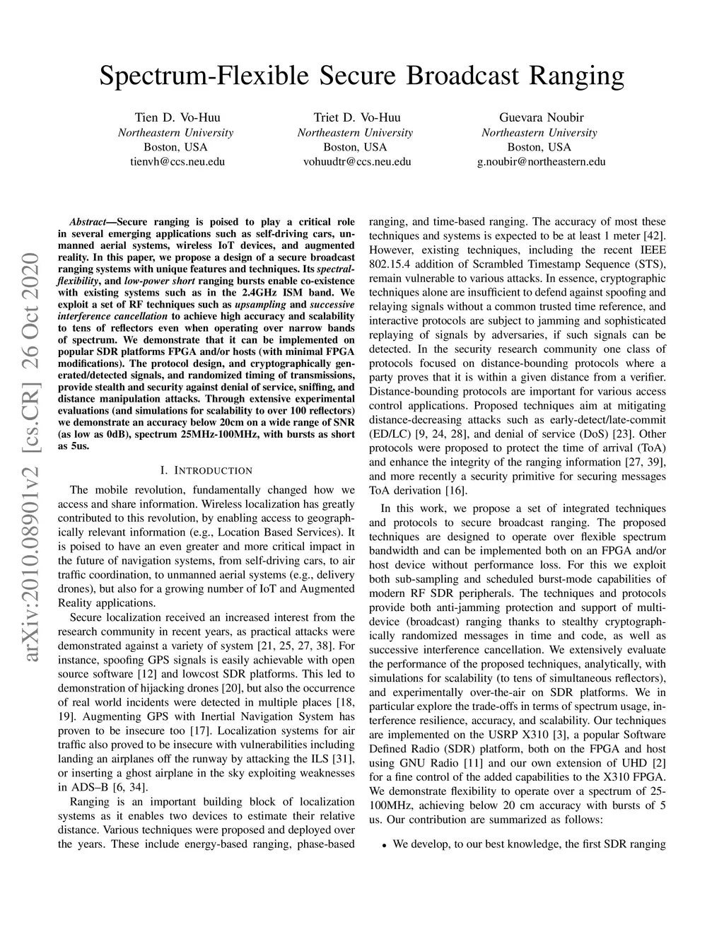 Secure ranging is poised to play a critical role in several emerging applications such as self-driving cars, unmanned aerial systems, wireless IoT devices, and augmented reality. In this paper, we propose a design of a secure broadcast ranging systems with unique features and techniques. Its spectral-flexibility, and low-power short ranging bursts enable co-existence with existing systems such as in the 2.4GHz ISM band. We exploit a set of RF techniques such as upsampling and successive interference cancellation to achieve high accuracy and scalability to tens of reflectors even when operating over narrow bands of spectrum. We demonstrate that it can be implemented on popular SDR platforms FPGA and/or hosts (with minimal FPGA modifications). The protocol design, and cryptographically generated/detected signals, and randomized timing of transmissions, provide stealth and security against denial of service, sniffing, and distance manipulation attacks. Through extensive experimental evaluations (and simulations for scalability to over 100 reflectors) we demonstrate an accuracy below 20cm on a wide range of SNR (as low as 0dB), spectrum 25MHz-100MHz, with bursts as short as 5us.