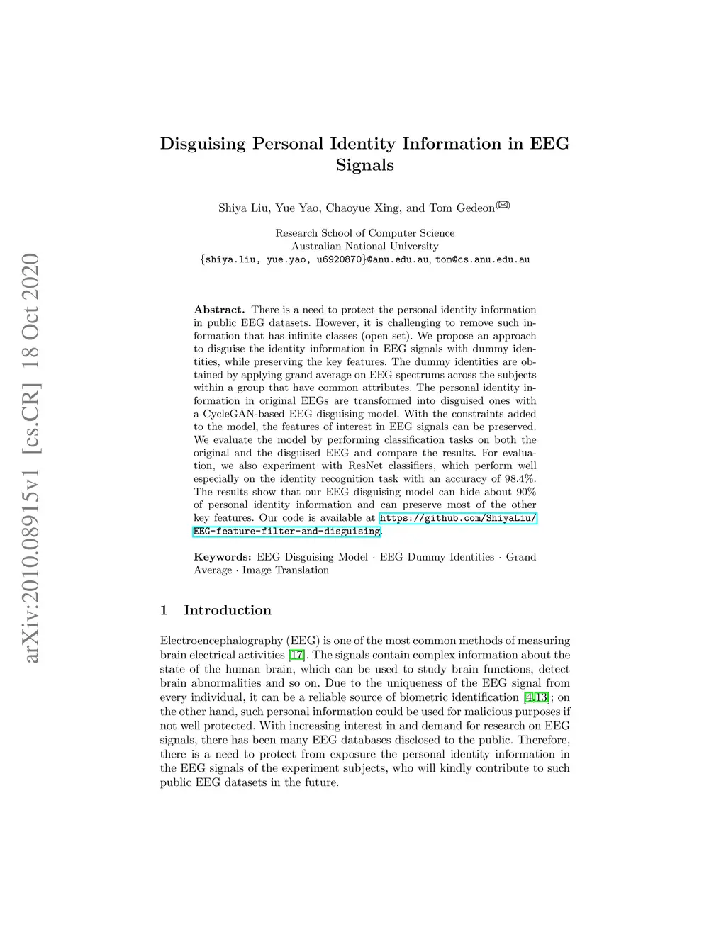 There is a need to protect the personal identity information in public EEG datasets. However, it is challenging to remove such information that has infinite classes (open set). We propose an approach to disguise the identity information in EEG signals with dummy identities, while preserving the key features. The dummy identities are obtained by applying grand average on EEG spectrums across the subjects within a group that have common attributes. The personal identity information in original EEGs are transformed into disguised ones with a CycleGANbased EEG disguising model. With the constraints added to the model, the features of interest in EEG signals can be preserved. We evaluate the model by performing classification tasks on both the original and the disguised EEG and compare the results. For evaluation, we also experiment with ResNet classifiers, which perform well especially on the identity recognition task with an accuracy of 98.4%. The results show that our EEG disguising model can hide about 90% of personal identity information and can preserve most of the other key features.