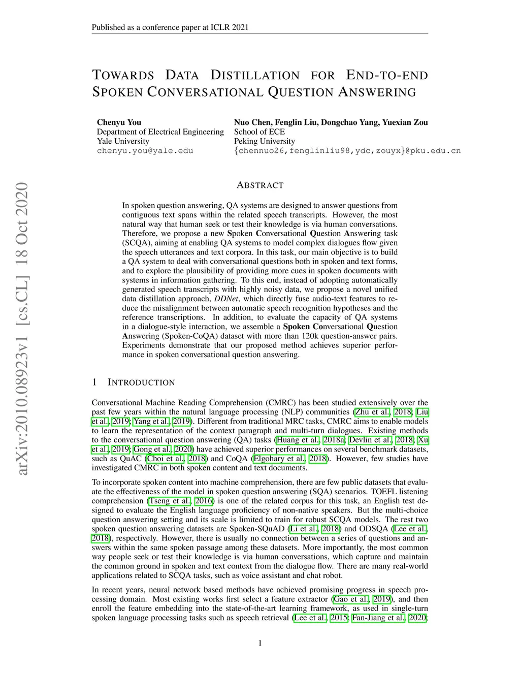 In spoken question answering, QA systems are designed to answer questions from contiguous text spans within the related speech transcripts. However, the most natural way that human seek or test their knowledge is via human conversations. Therefore, we propose a new Spoken Conversational Question Answering task (SCQA), aiming at enabling QA systems to model complex dialogues flow given the speech utterances and text corpora. In this task, our main objective is to build a QA system to deal with conversational questions both in spoken and text forms, and to explore the plausibility of providing more cues in spoken documents with systems in information gathering. To this end, instead of adopting automatically generated speech transcripts with highly noisy data, we propose a novel unified data distillation approach, DDNet, which directly fuse audio-text features to reduce the misalignment between automatic speech recognition hypotheses and the reference transcriptions. In addition, to evaluate the capacity of QA systems in a dialogue-style interaction, we assemble a Spoken Conversational Question Answering (Spoken-CoQA) dataset with more than 120k question-answer pairs. Experiments demonstrate that our proposed method achieves superior performance in spoken conversational question answering.