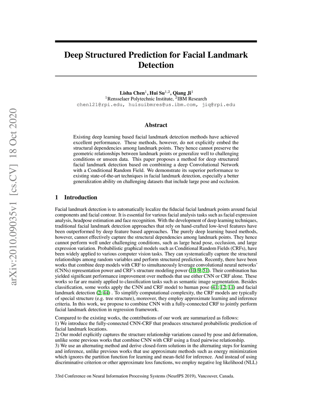 Existing deep learning based facial landmark detection methods have achieved excellent performance. These methods, however, do not explicitly embed the structural dependencies among landmark points. They hence cannot preserve the geometric relationships between landmark points or generalize well to challenging conditions or unseen data. This paper proposes a method for deep structured facial landmark detection based on combining a deep Convolutional Network with a Conditional Random Field. We demonstrate its superior performance to existing state-of-the-art techniques in facial landmark detection, especially a better generalization ability on challenging datasets that include large pose and occlusion.