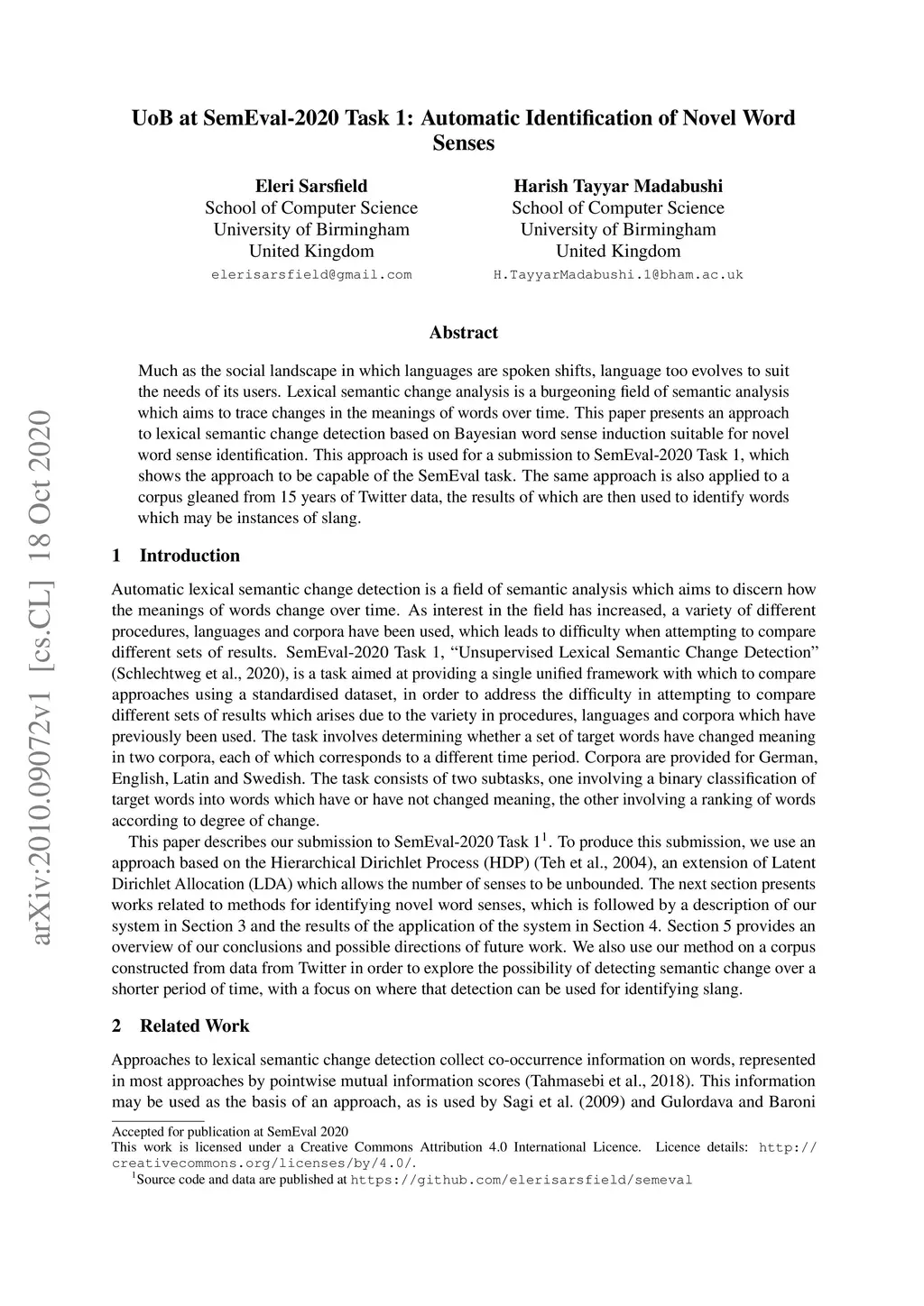 UoB at SemEval-2020 Task 1: Automatic Identification of Novel Word