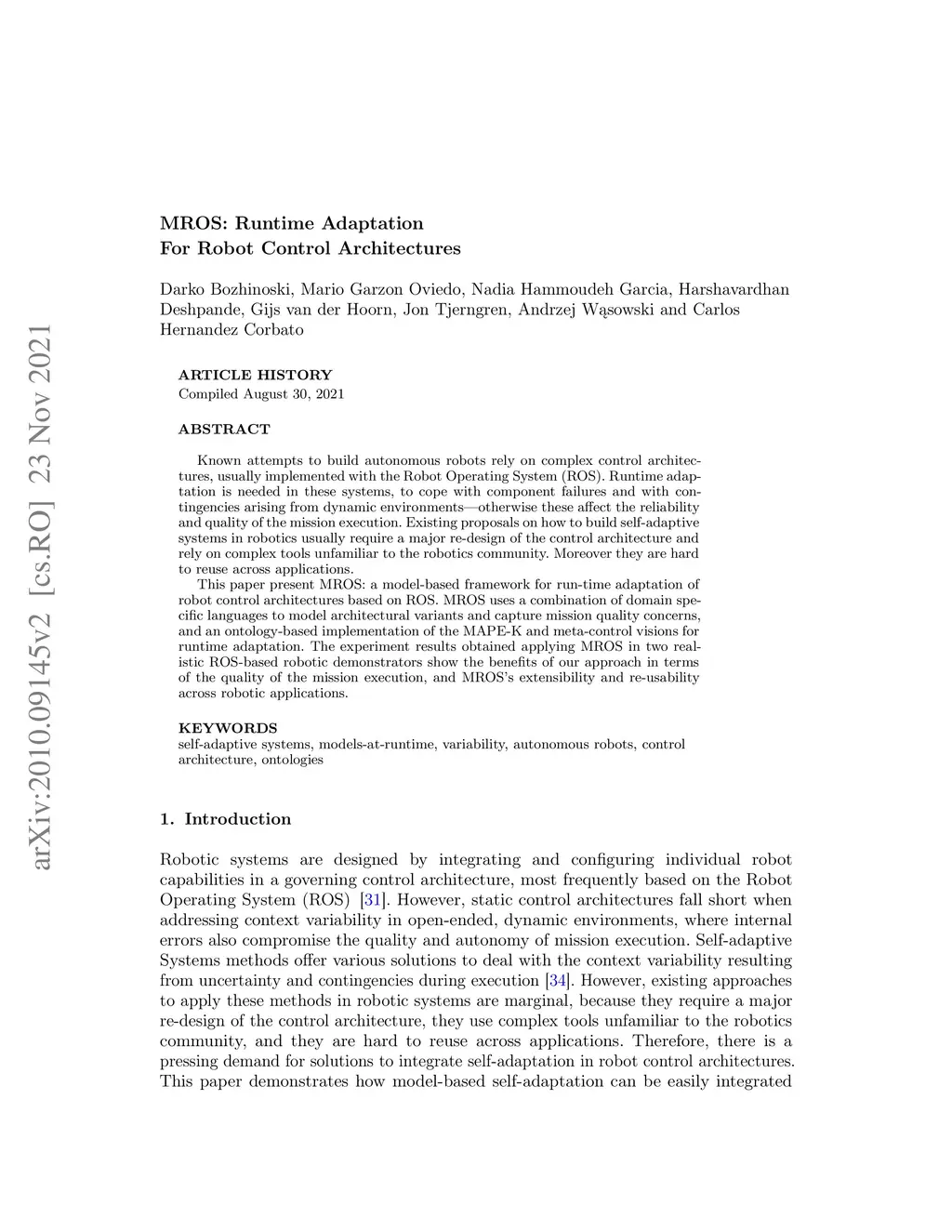 Known attempts to build autonomous robots rely on complex control architectures, often implemented with the Robot Operating System platform (ROS). Runtime adaptation is needed in these systems, to cope with component failures and with contingencies arising from dynamic environments-otherwise, these affect the reliability and quality of the mission execution. Existing proposals on how to build self-adaptive systems in robotics usually require a major re-design of the control architecture and rely on complex tools unfamiliar to the robotics community. Moreover, they are hard to reuse across applications. This paper presents MROS: a model-based framework for run-time adaptation of robot control architectures based on ROS. MROS uses a combination of domain-specific languages to model architectural variants and captures mission quality concerns, and an ontology-based implementation of the MAPE-K and meta-control visions for run-time adaptation. The experiment results obtained applying MROS in two realistic ROS-based robotic demonstrators show the benefits of our approach in terms of the quality of the mission execution, and MROS' extensibility and re-usability across robotic applications.